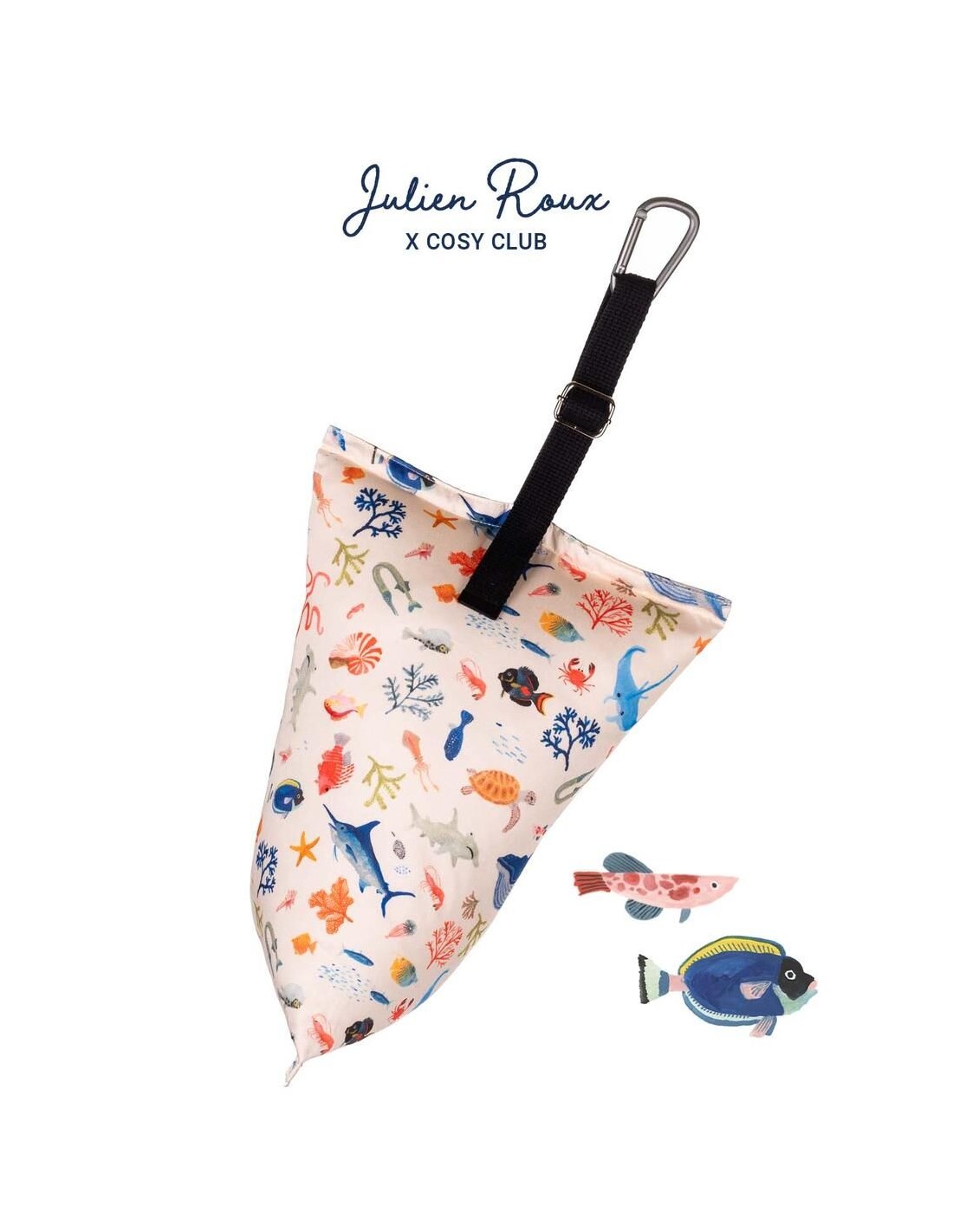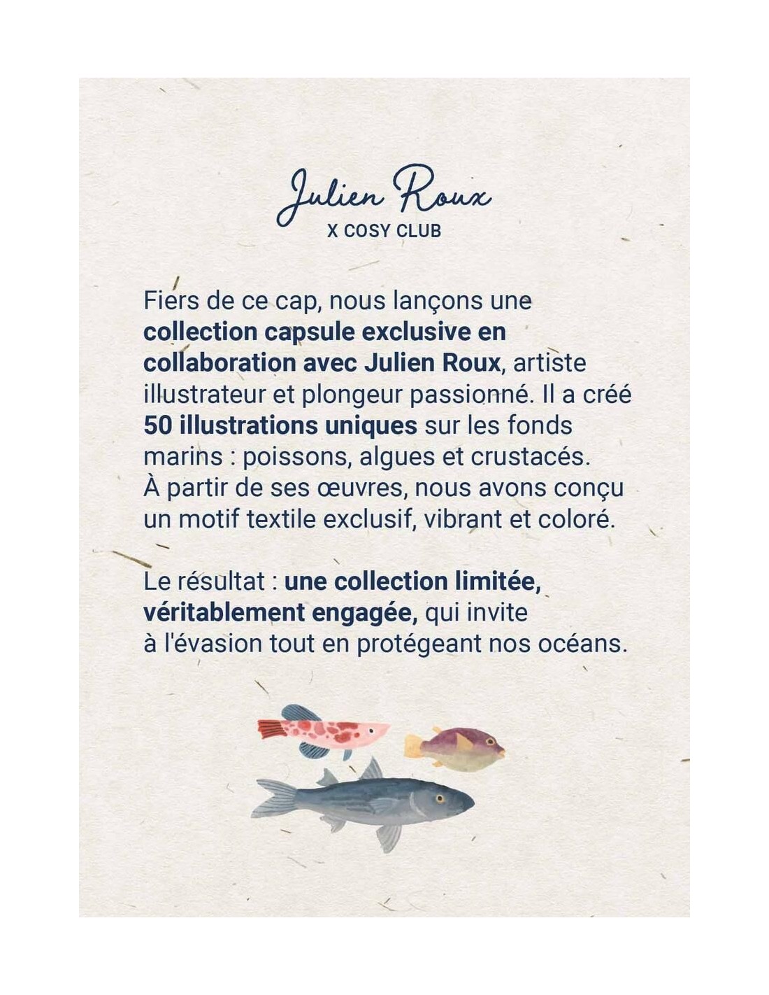 Fiers de ce cap, nous lançons une collection capsule exclusive en collaboration avec Julien Roux, artiste illustrateur et plongeur passionné. Il a créé 50 illustrations uniques sur les fonds marins : poissons, algues et crustacés. À partir de ses œuvres, nous avons conçu un motif textile exclusif, vibrant et coloré. Le résultat : une collection limitée, véritablement engagée, qui invite à l'évasion tout en protégeant nos océans.