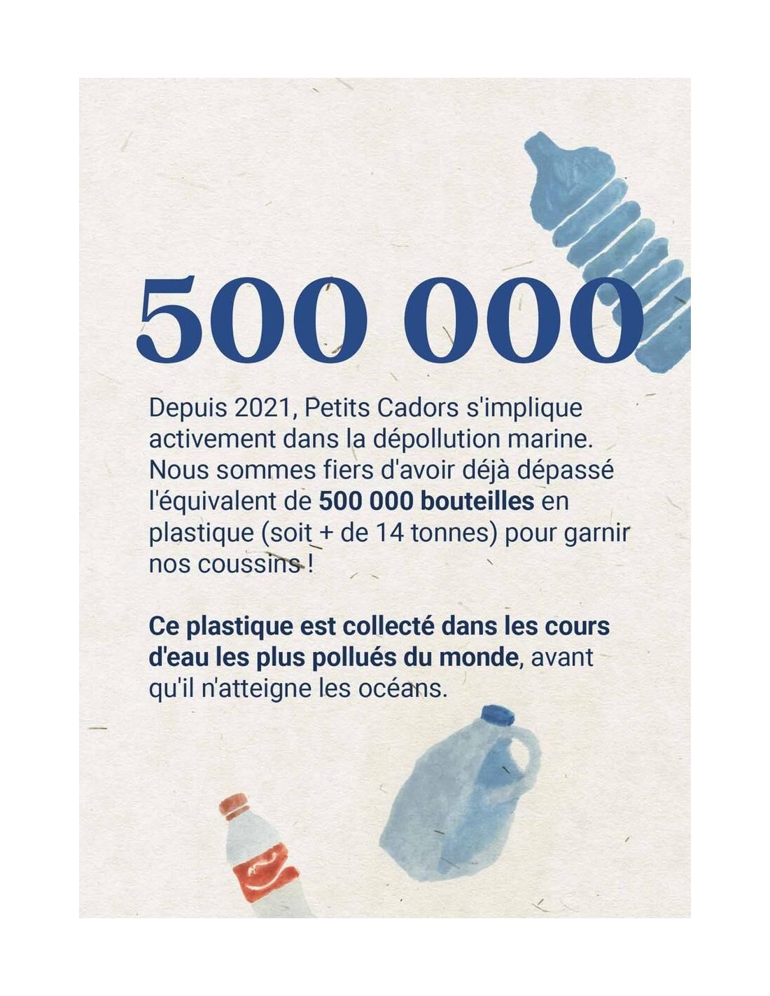 Depuis 2021, Cosy Club (ex Petits Cadors) s'implique activement dans la dépollution marine. Nous sommes fiers d'avoir déjà dépassé l'équivalent de 500 000 bouteilles en plastique (soit + de 14 tonnes) pour garnir nos coussins ! Ce plastique est collecté dans les cours d'eau les plus pollués du monde, avant qu'il n'atteigne les océans.