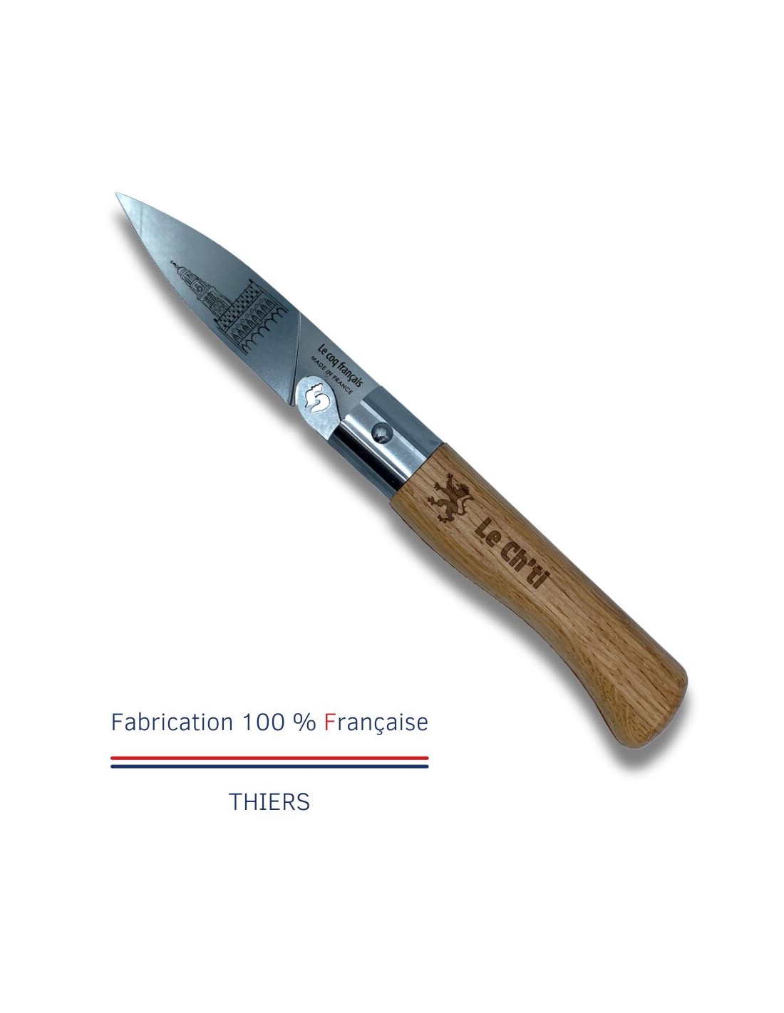 Duo couteau & étui à l’effigie des terroirs français, présenté sur carte. Manche en chêne robuste et virole Lock. Fabriqué en France.