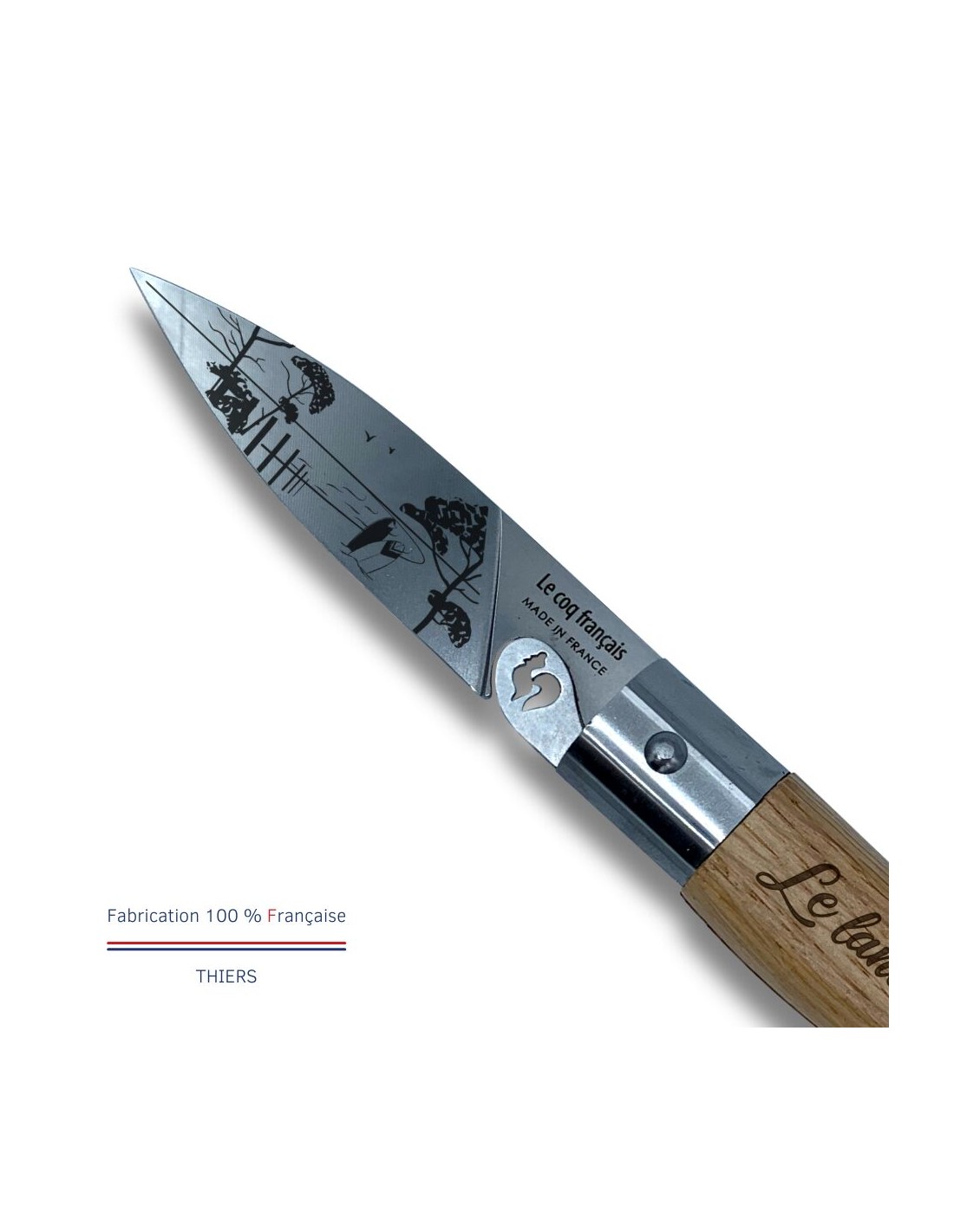 Duo couteau & étui à l’effigie des terroirs français, présenté sur carte. Manche en chêne robuste et virole Lock. Fabriqué en France.