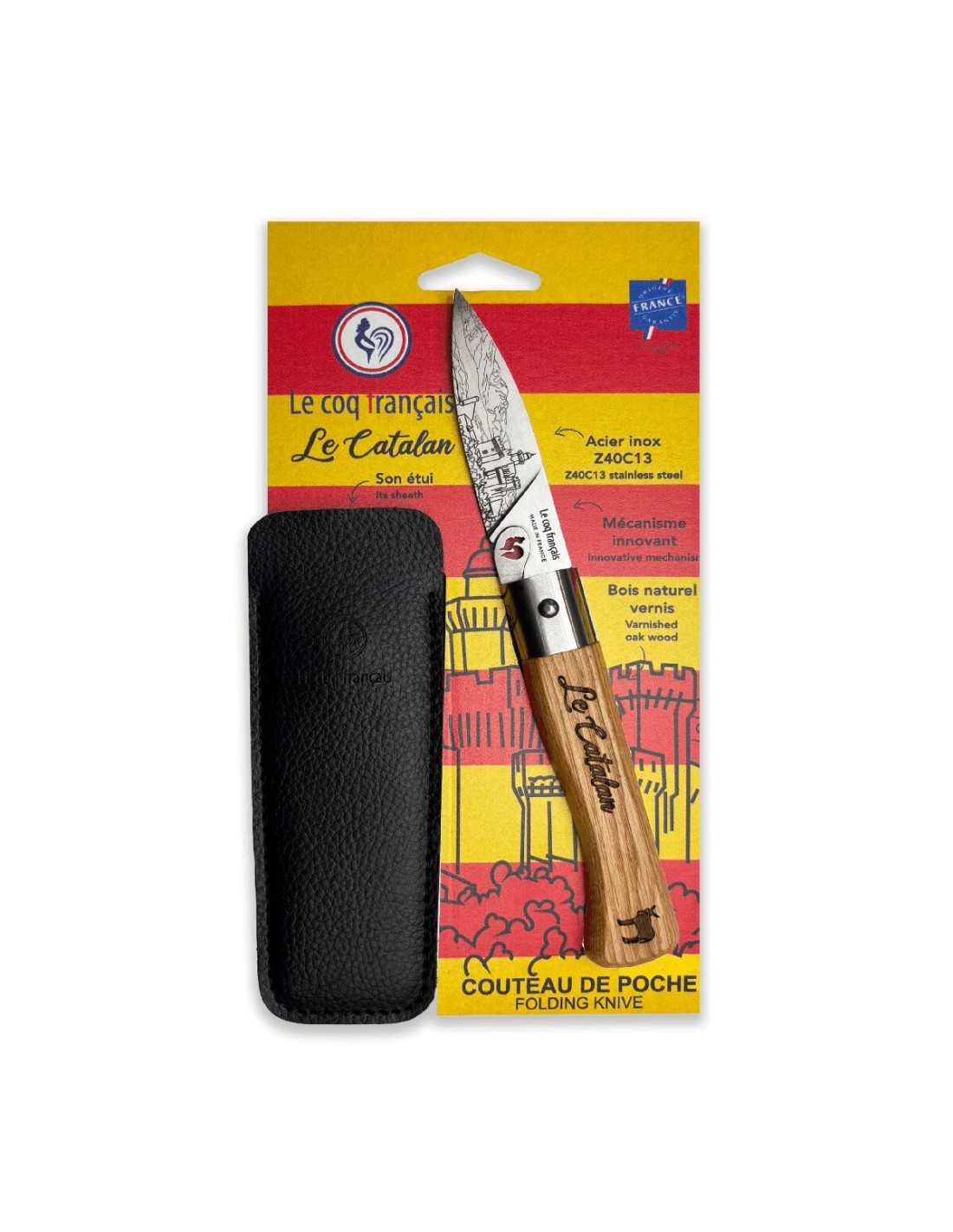 Carte Duo Le Catalan - Couteau de poche Le Coq Authentique Le Catalan - manche chêne + étui
