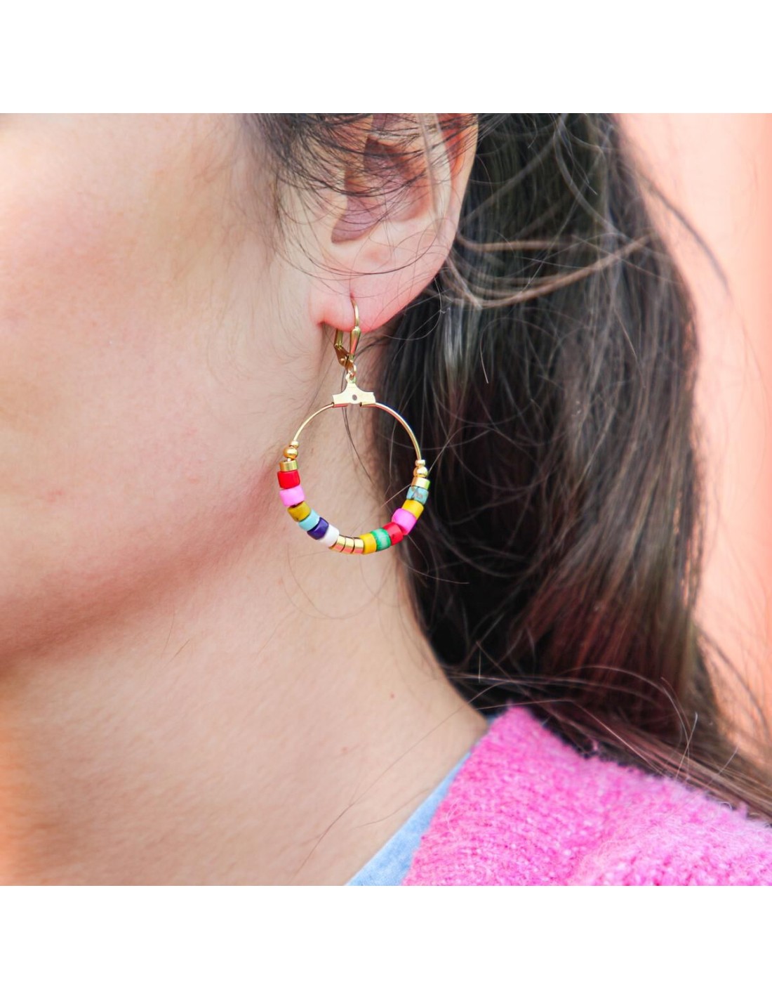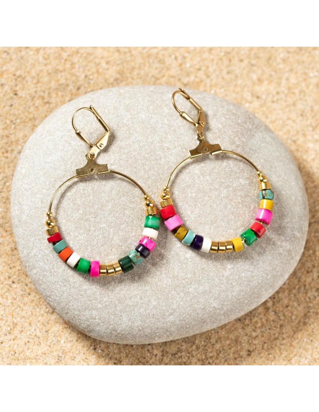Les boucles d'oreilles Chamarel se composent de pierres en howlite multicolore. Une touche de gaieté à porter en toute simplicité.