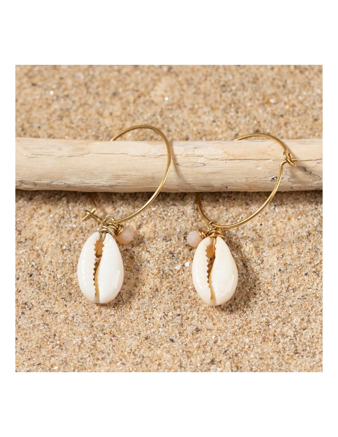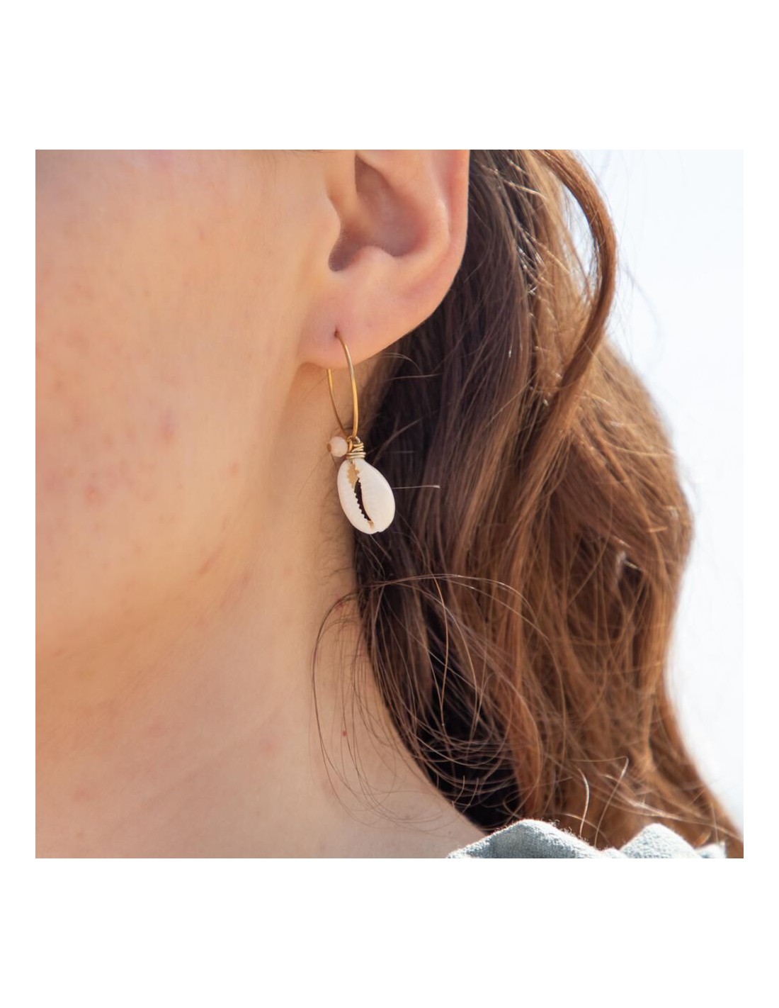 Les boucles d'oreilles Amélie, par leur délicatesse, sont parfaites à toute saison. Les cauris donnent des envies d'évasion sur les longues plages de sable chaud.