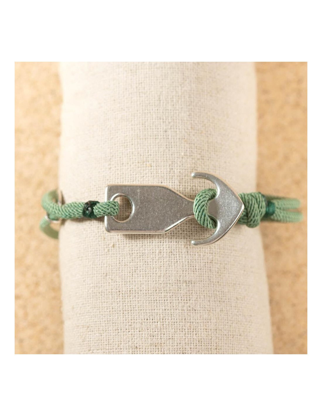 Le bracelet pour homme Alarick associe un cordon vert d'eau et une ancre en métal argenté qui apportent une touche marine.