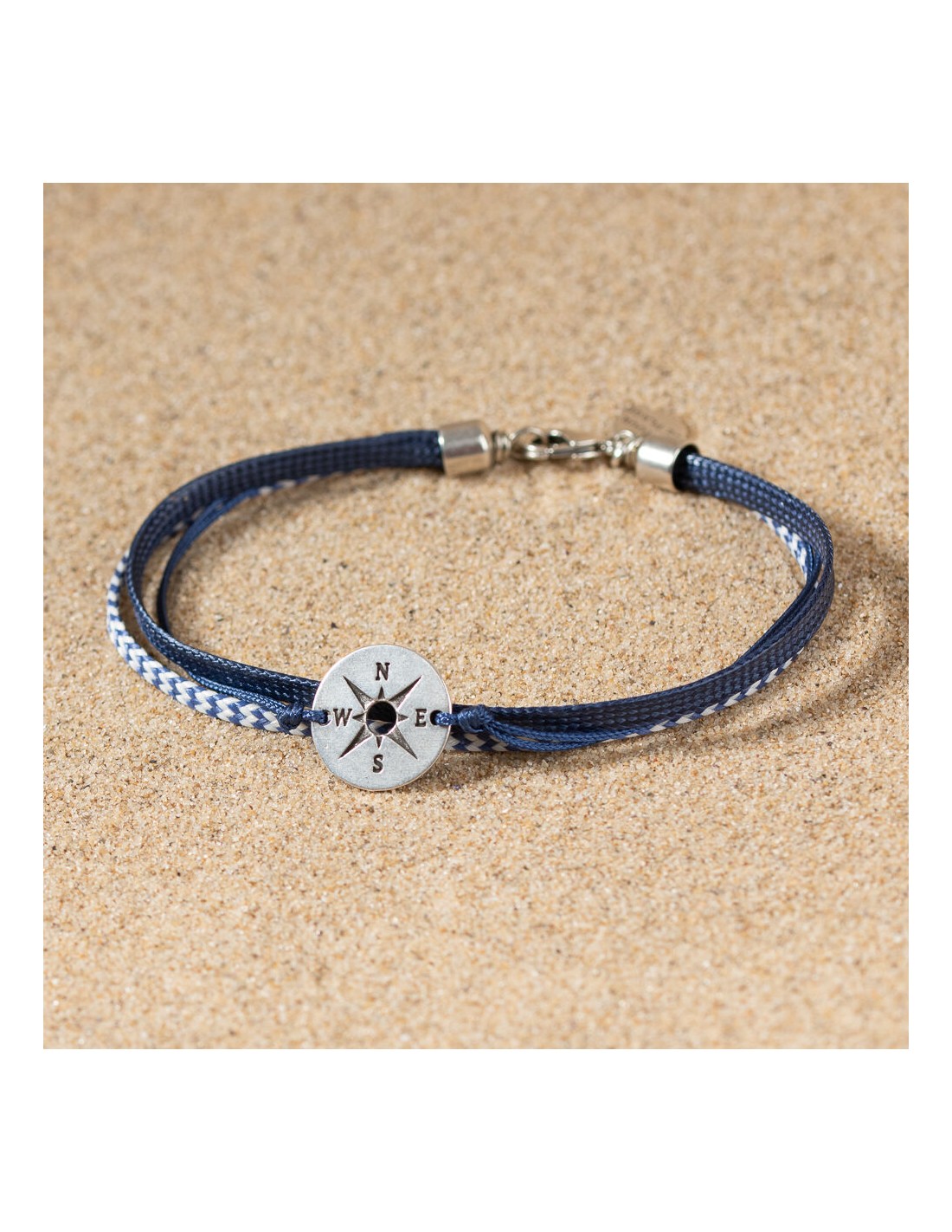 Cap vers l'aventure avec le bracelet pour homme Vent. Sa rose des vents argentée et ses cordons bleutés invitent à prendre le large.