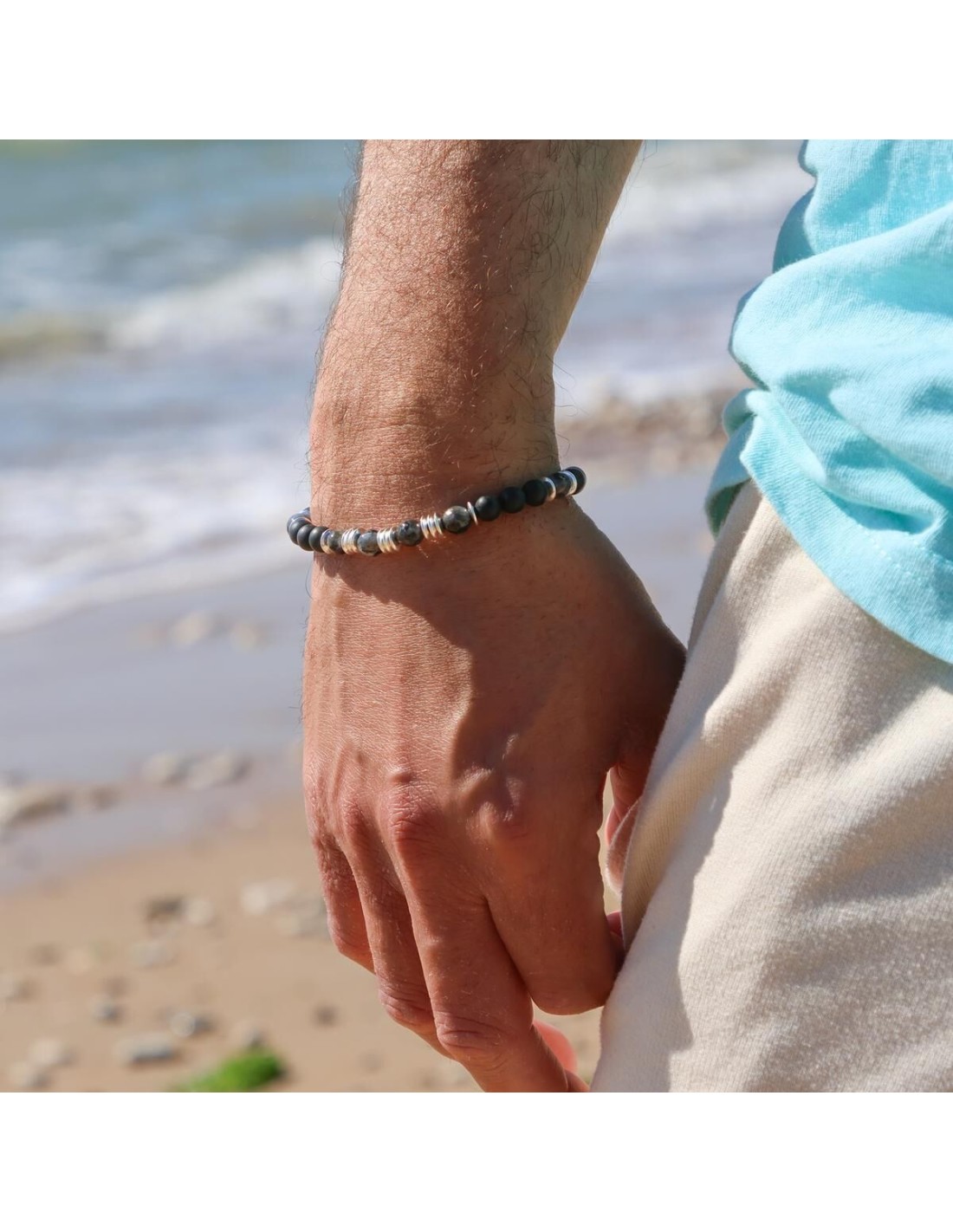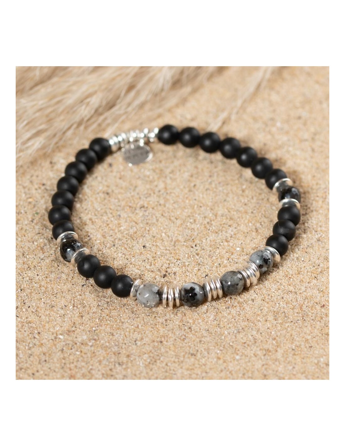 Associant perles de labradorite et d'agate noir, rehaussé de perles en métal argenté, ce bracelet pour homme révèle un caractère sobre et audacieux.