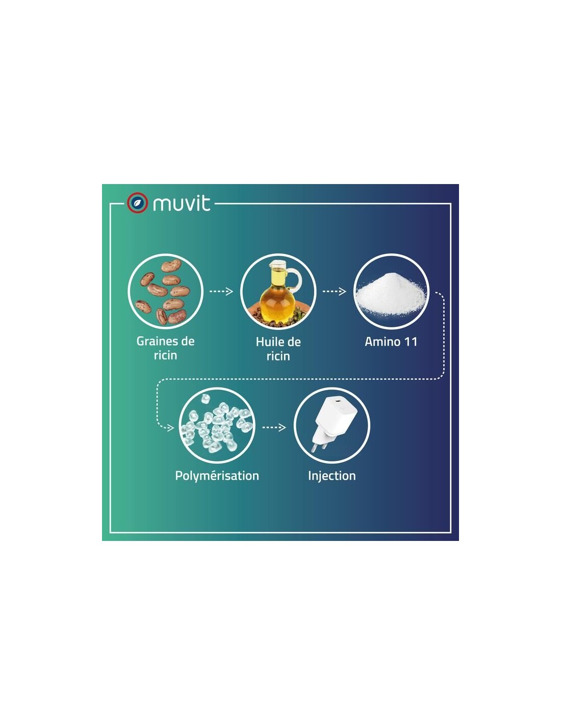 Le Chargeur Français BIOOFnix incarne une véritable révolution dans l’univers de la charge mobile. Premier chargeur au monde fabriqué à partir de BIOOFnix, un polymère biosourcé dérivé de l’huile de ricin, il conjugue performance technologique, design compact et engagement environnemental. Conçu et fabriqué en France, il est la preuve que l’innovation responsable est possible, sans compromis sur la puissance.