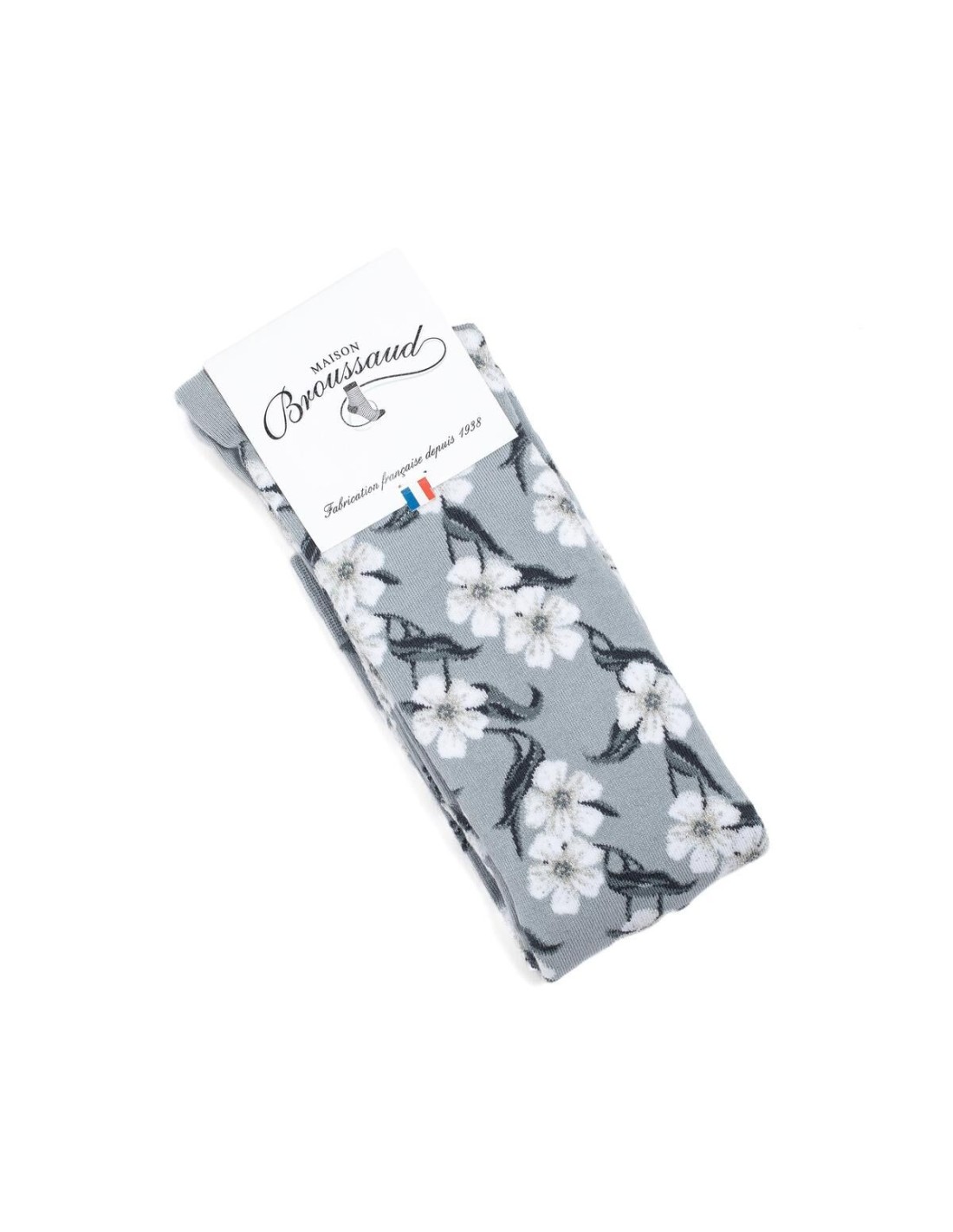 Les mi-bas "Fleurs" de la Maison Broussaud sont romantiques, délicats et un brin vintage. Leur teinte gris clair, très douce, s'associe facilement à toutes sortes de tenue. Le motif végétal qui parcourt toute la jambe de la chaussette est finement brodé, rehaussé de légers reflets métallisés pour plus de féminité.