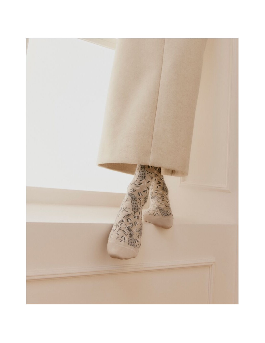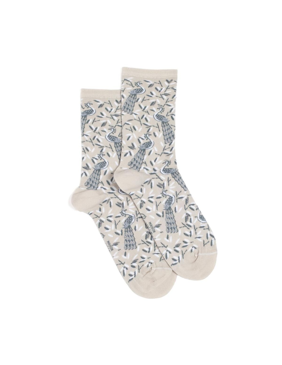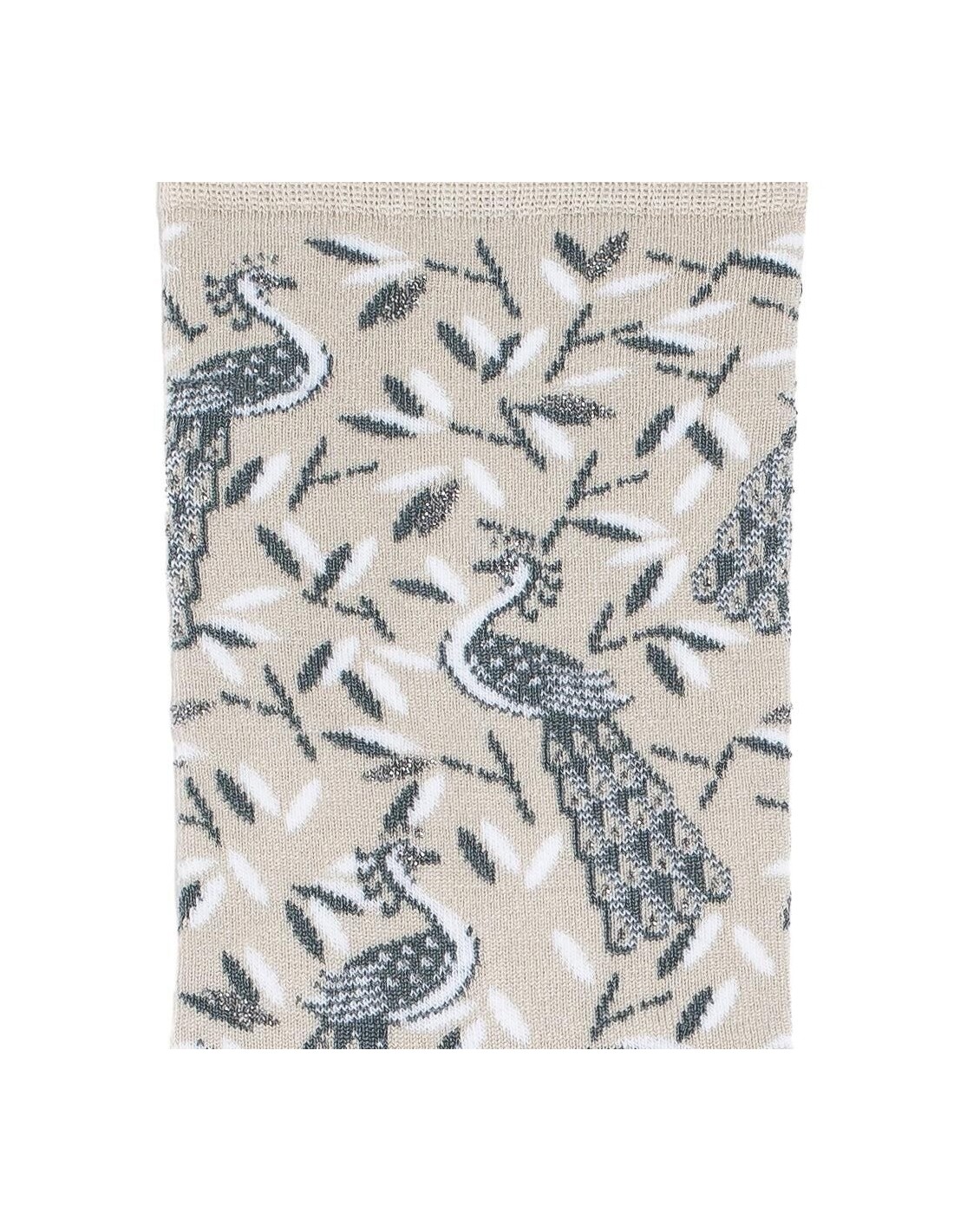 Cette paire de chaussettes pour femme célèbre la grâce du paon dans un écrin de douceur. Sur fond gris clair, doux et lumineux, des oiseaux tricotés de bleu déploient leurs plumes au milieu d'un feuillage délicat. Le contraste raffiné des couleurs et la finesse du motif donnent beaucoup de poésie à ce modèle.