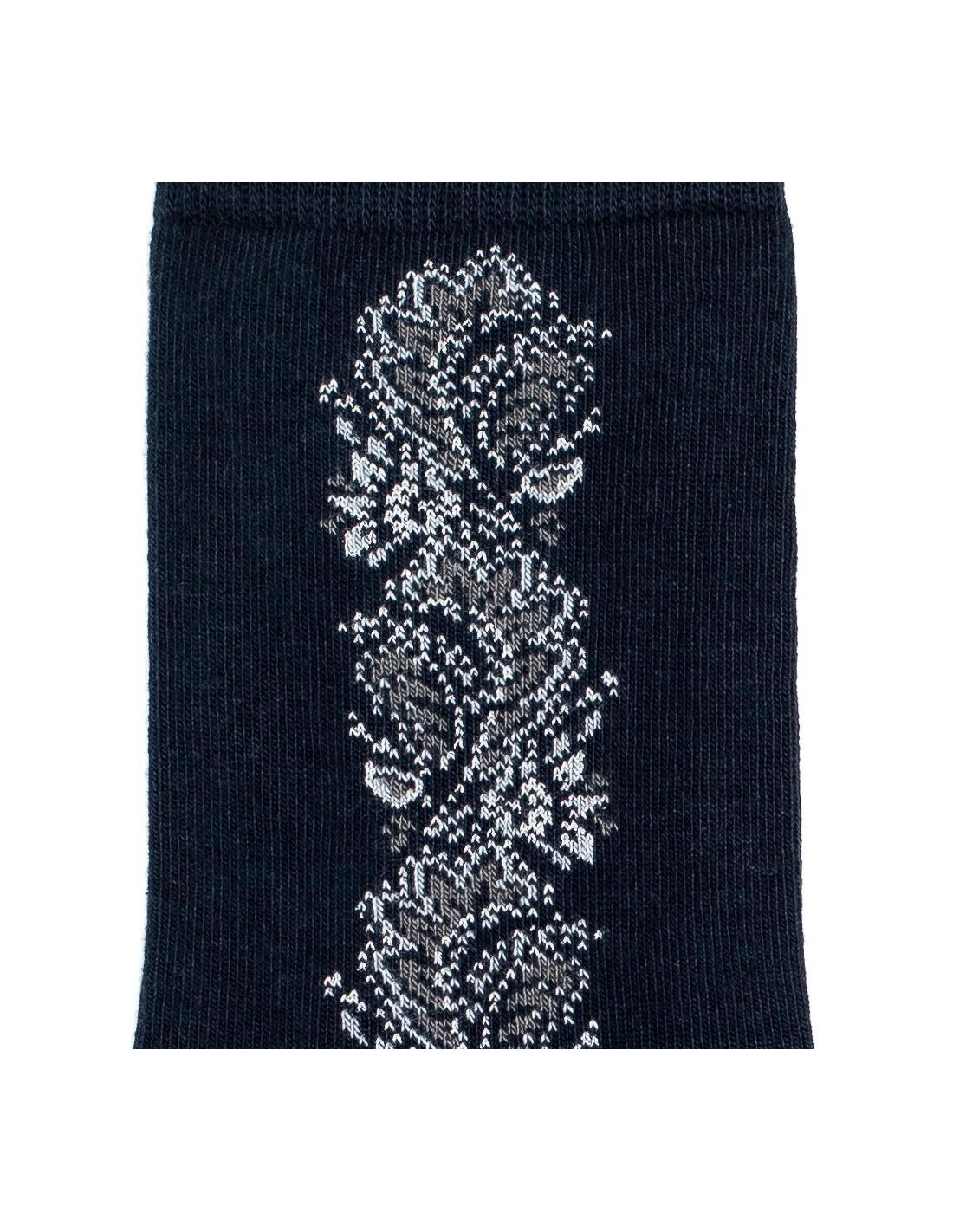 Les chaussettes "La Frise" s'ornent de fleurs délicates, tricotées à la verticale sur un fond bleu marine profond. Un motif très féminin qui structure la chaussette avec finesse et originalité ! Cette création de la Maison Broussaud, tout en discrétion et raffinement, attire tous les regards.