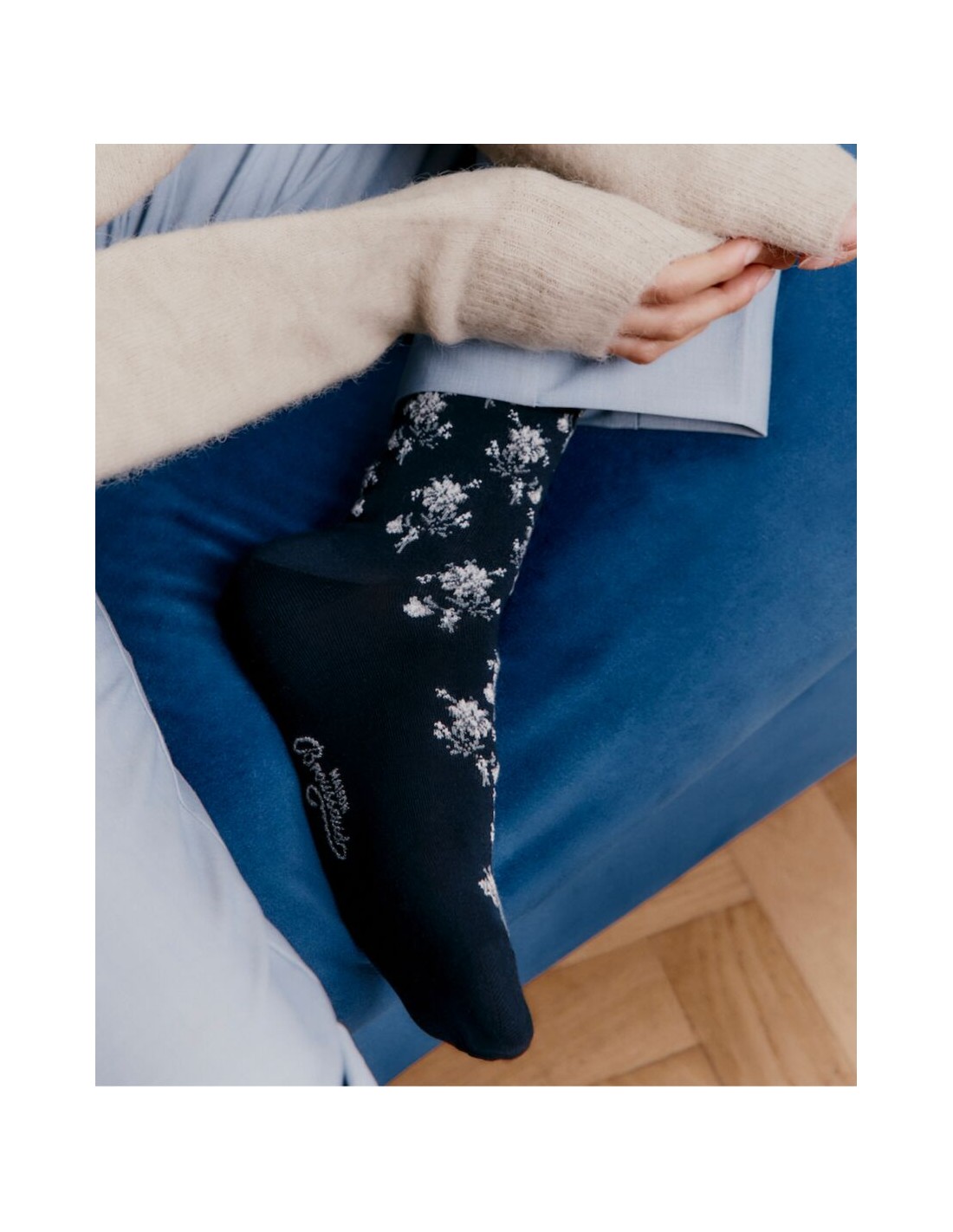La paire de chaussettes bleu marine "Les Fleurs" habille vos pieds d'un motif floral très délicat. Un design intemporel qui conjugue le charme classique du style français et une touche de raffinement en toute discrétion.