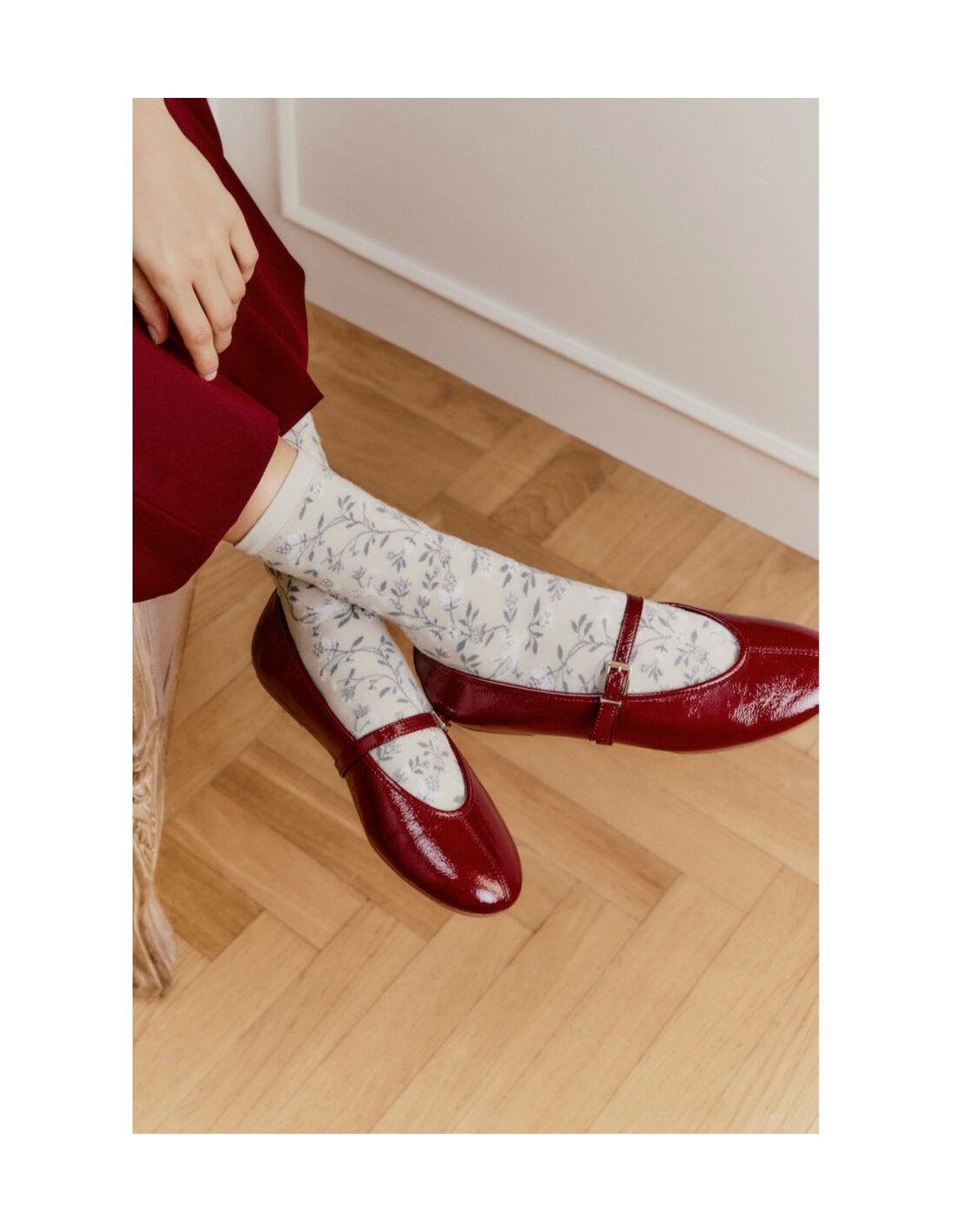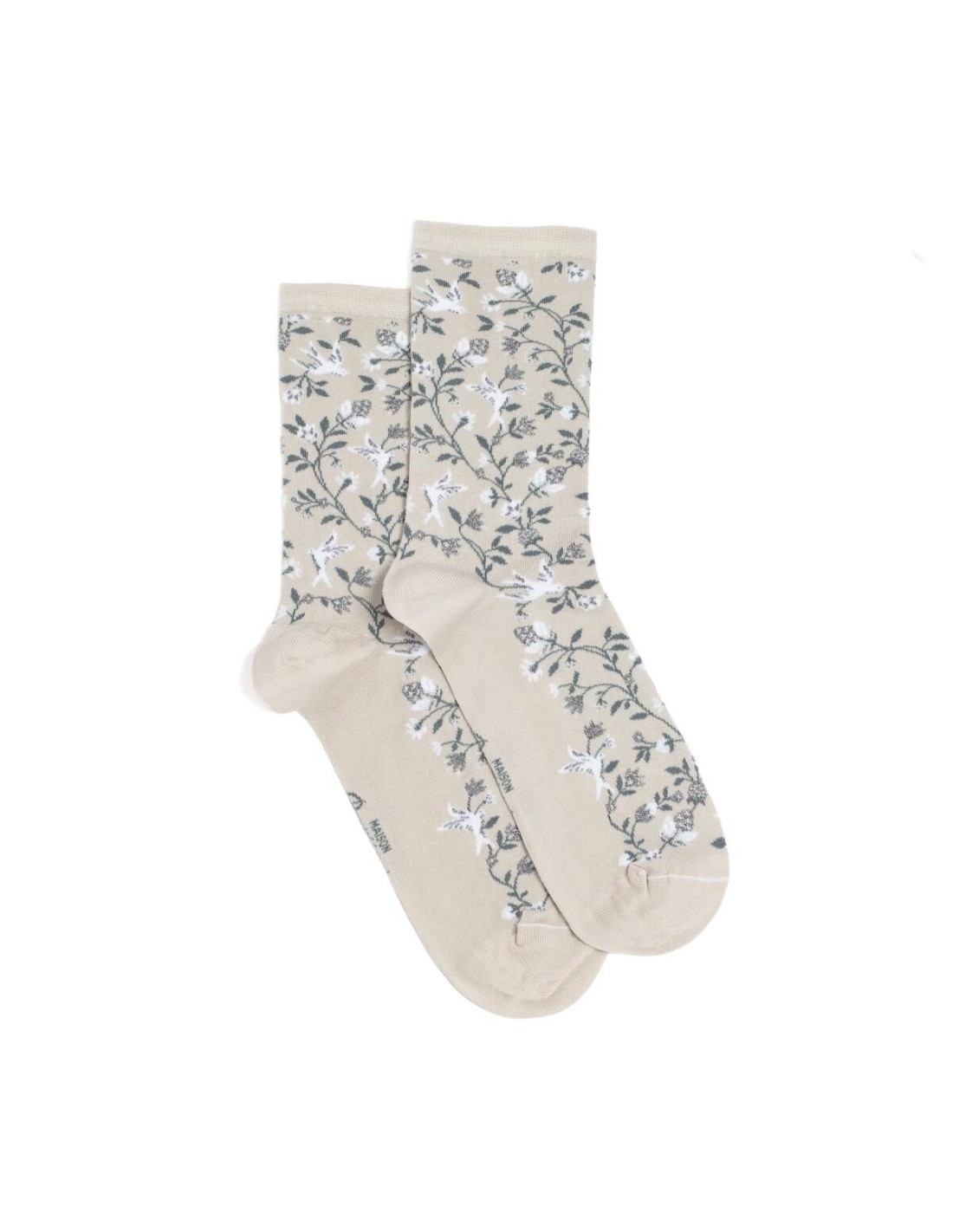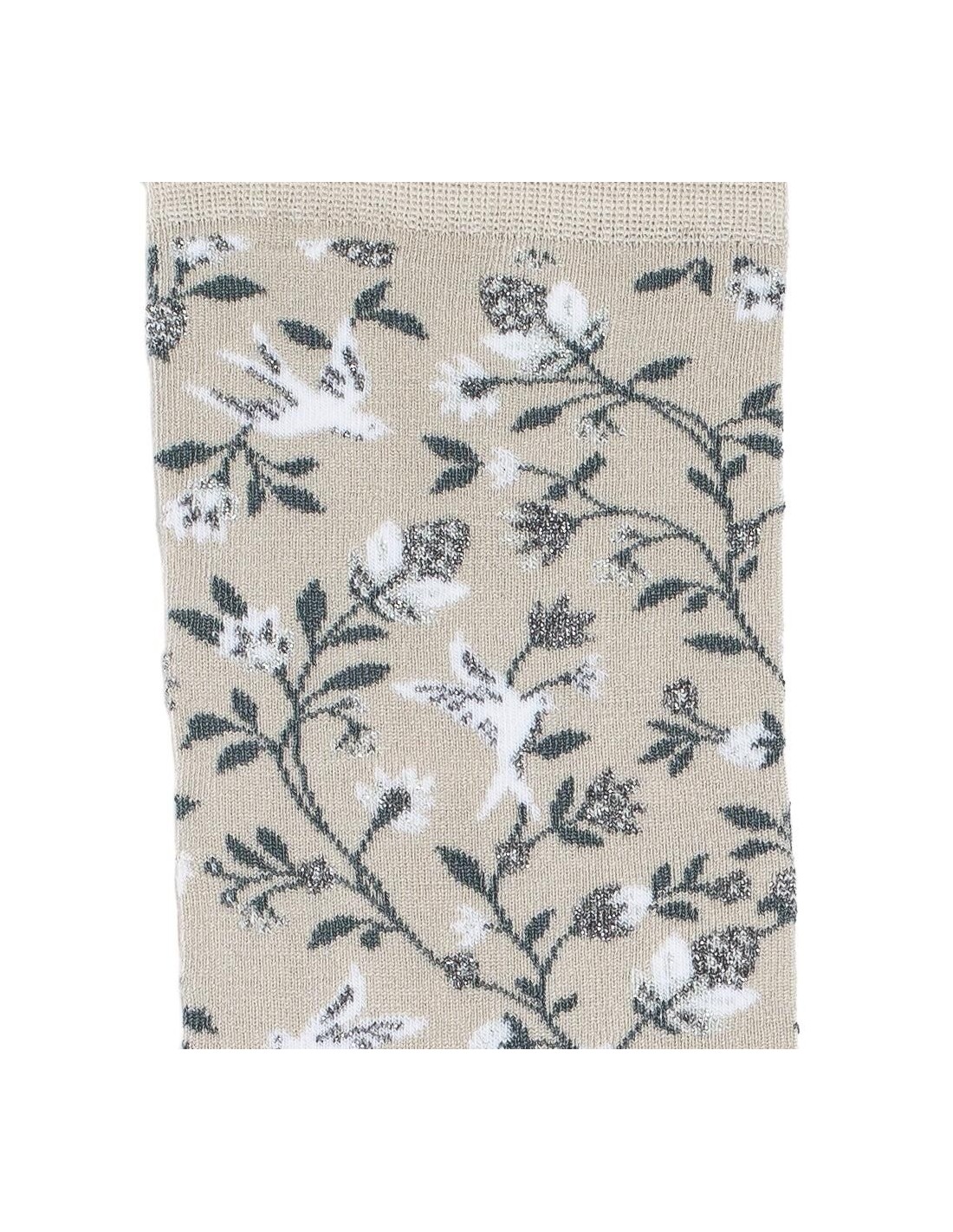 Sur fond gris pâle, les feuillages bleu foncé et les petites touches lumineuses composent un tableau tout en douceur. Les reflets argentés de ces chaussettes mi-hautes apportent la petite touche d'originalité et de brillance qu'il manque à votre tenue !