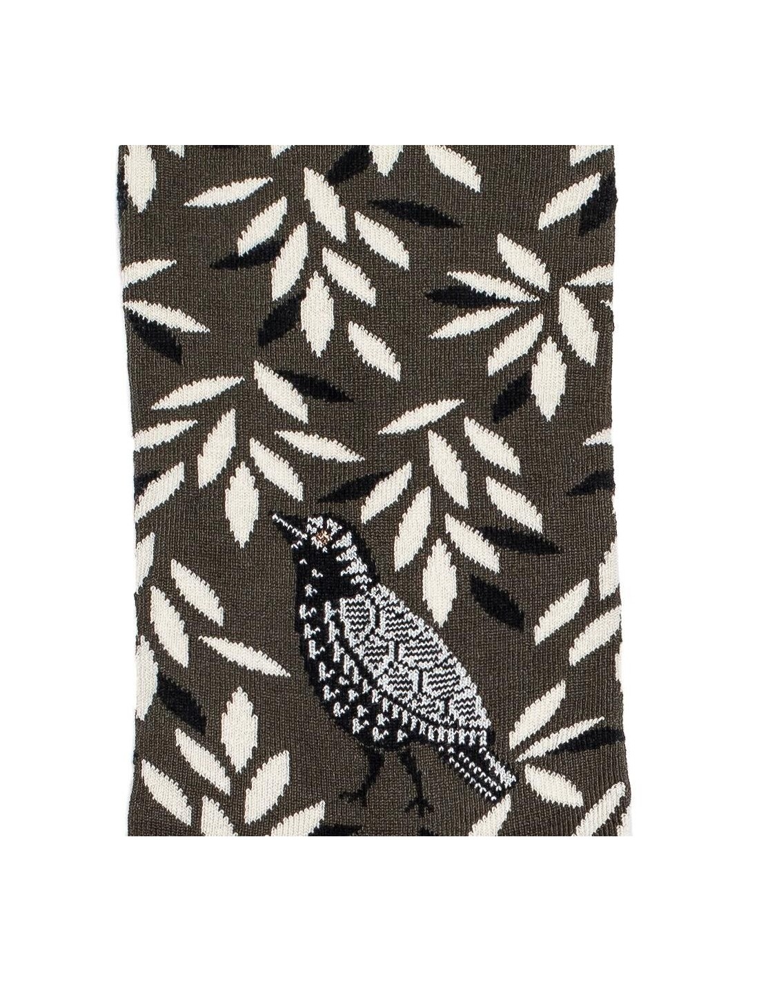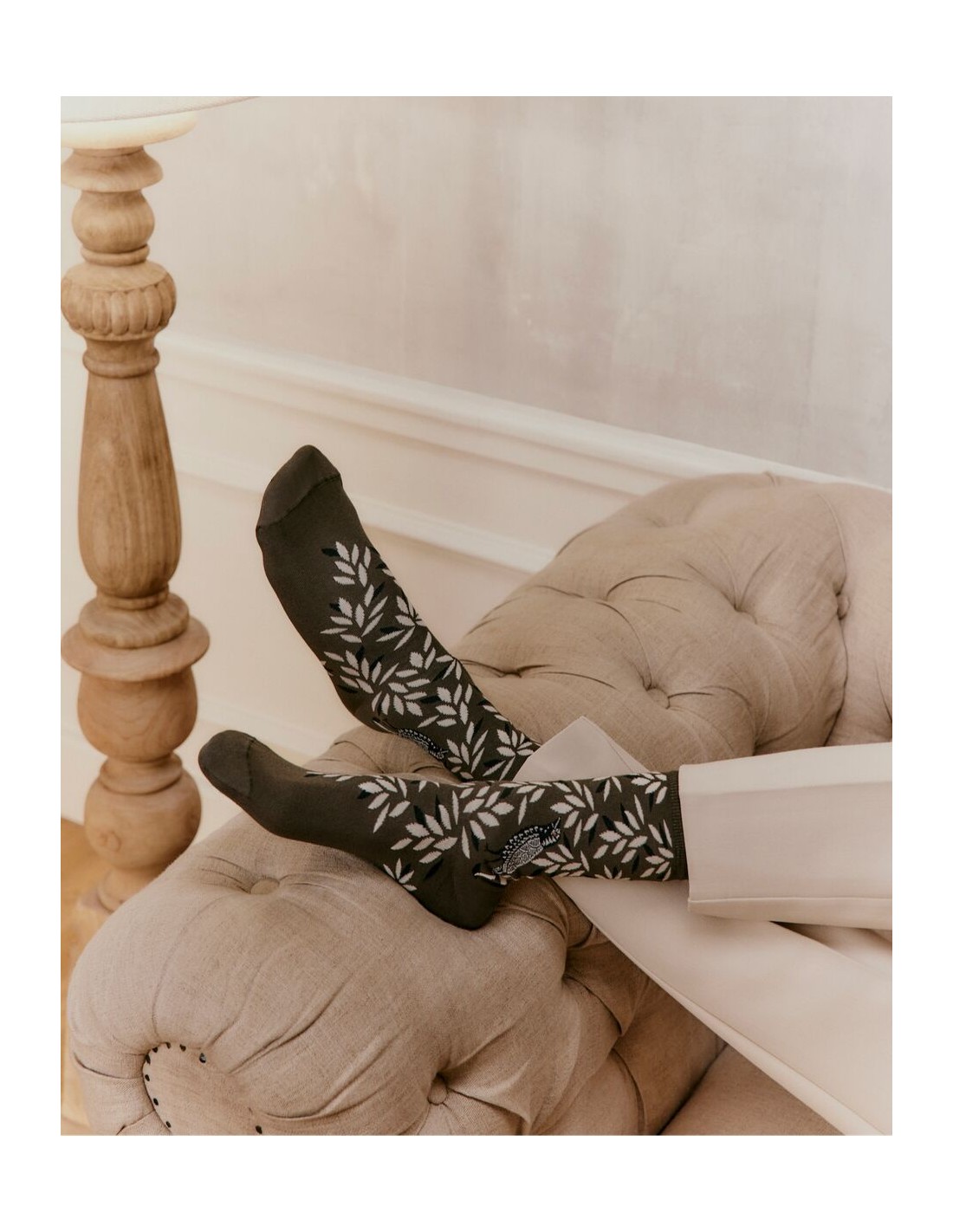 Imaginée par la Maison Broussaud, cette paire de chaussettes célèbre la nature avec élégance et finesse. Sur un fond kaki profond, un décor végétal en all-over et quelques touches métallisées soulignent le bel oiseau brodé sur chaque cheville.