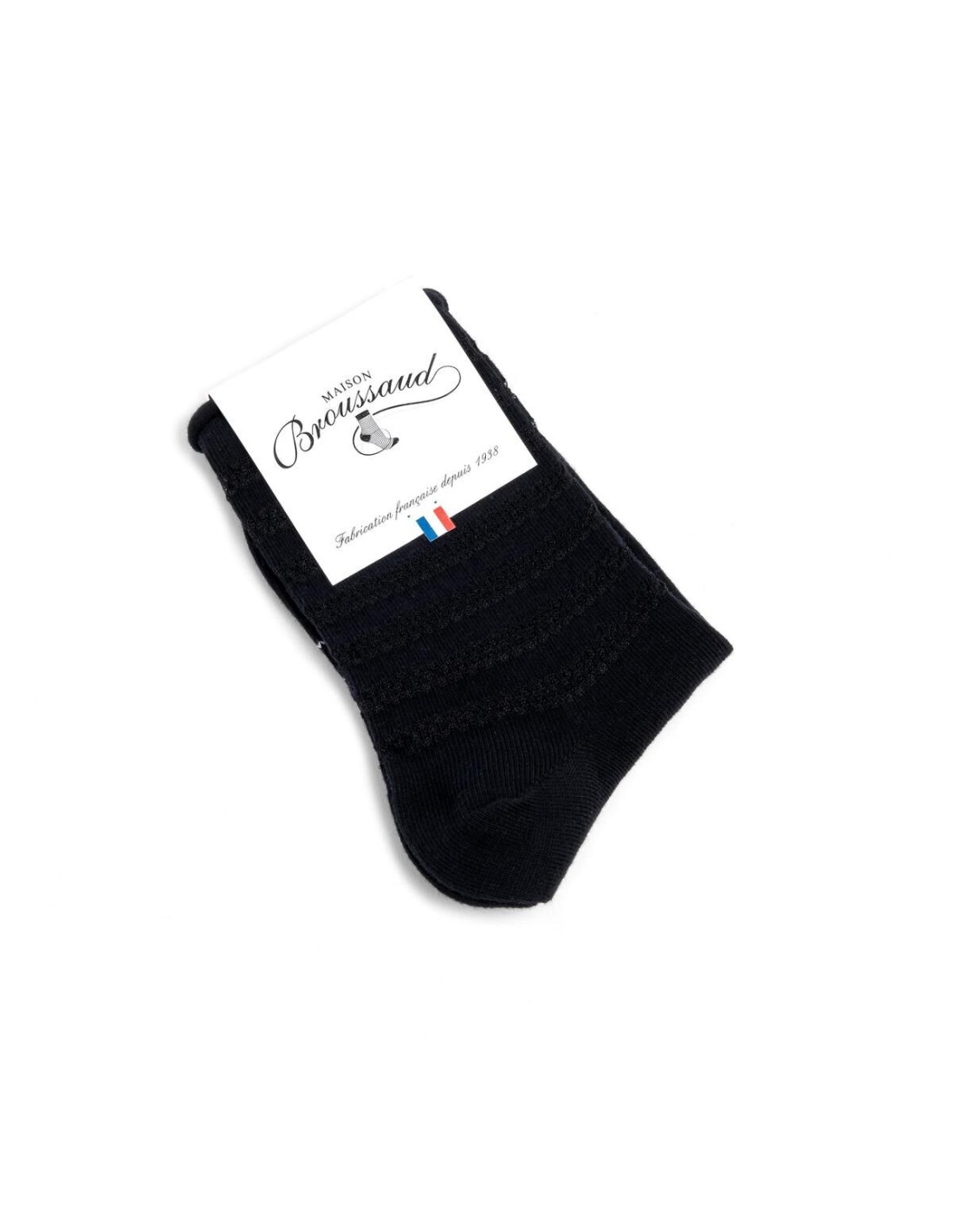 En automne et en hiver, laissez-vous séduire par l'élégance discrète de la maille résille Made in France. Ces chaussettes pour femme, fabriquées en coton de haute qualité, subliment chaque tenue avec leurs rayures aux motifs fantaisie. Conçues en noir élégant, elles dévoilent des zones de maille transparente au niveau de la cheville pour un effet raffiné et original. Parfaites avec une jupe, une robe, des baskets, des escarpins ou des bottines, elles s'adaptent à toutes vos envies. Alliant confort et style, ces chaussettes incarnent le savoir-faire rare de Maison Broussaud et sont indispensables à votre garde-robe.