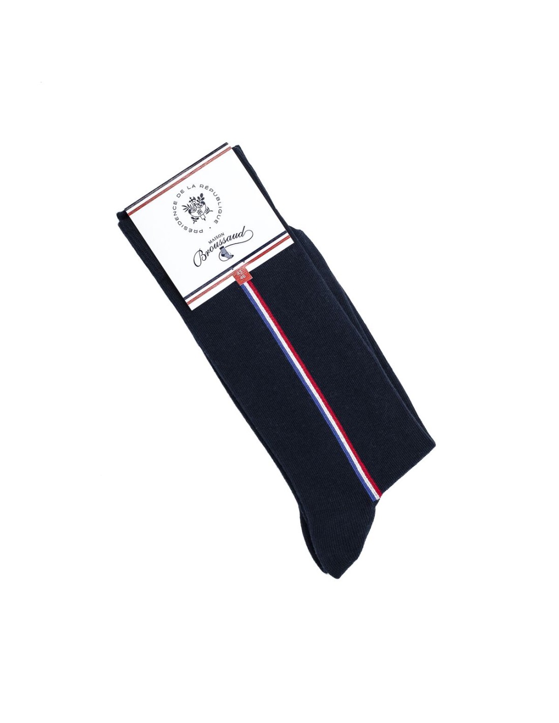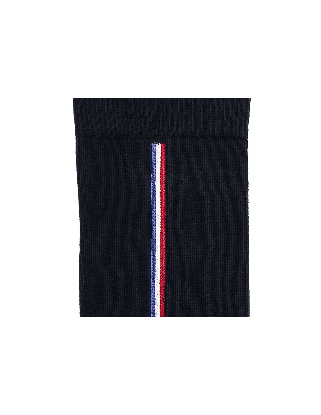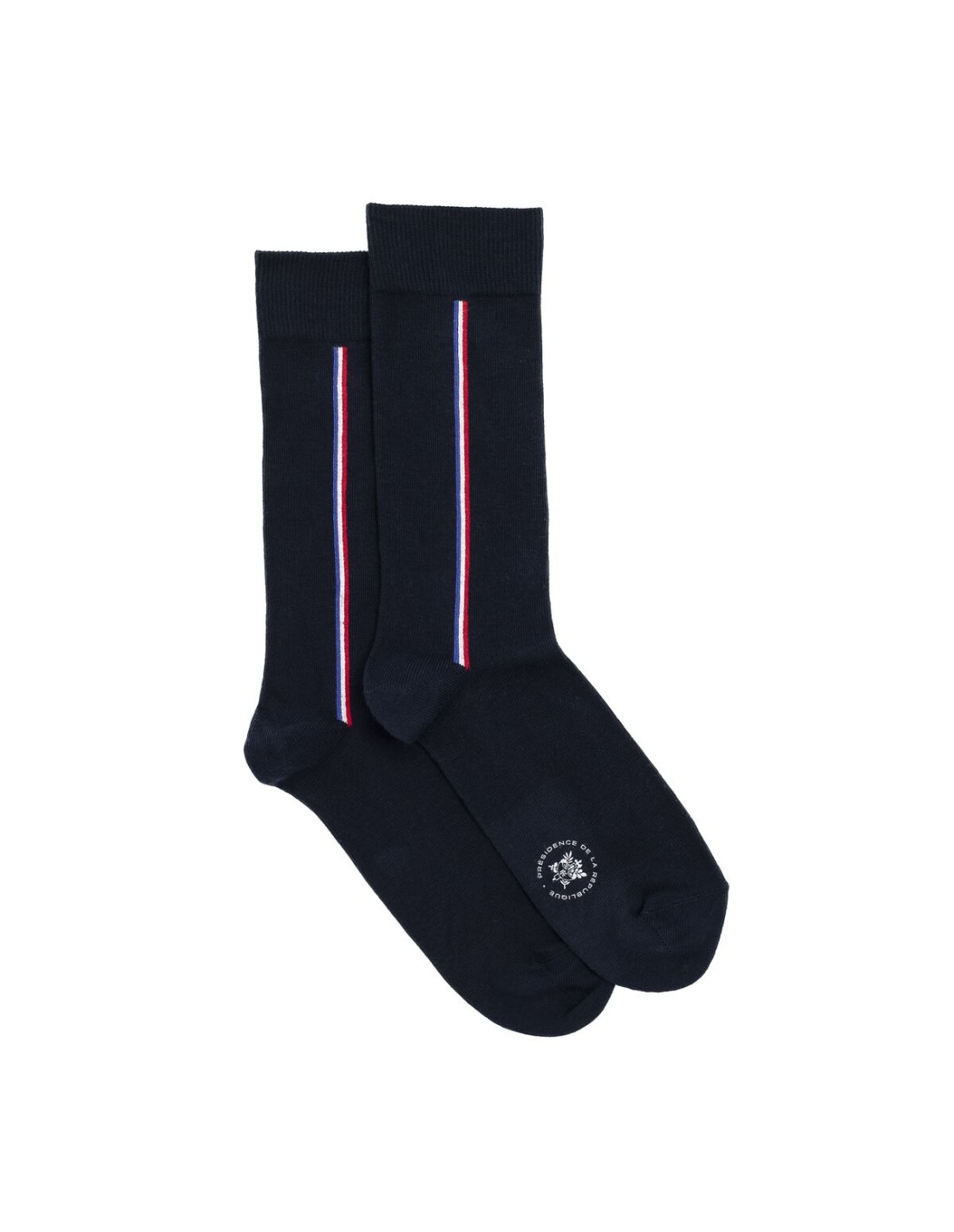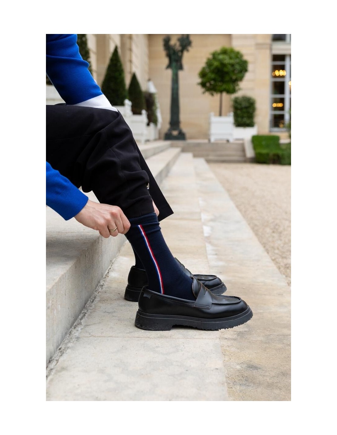 Exprimez votre élégance jusqu’au bout des pieds grâce à ce nouveau modèle exclusif de la collection Élysée. Imaginées et fabriquées en France par Maison Broussaud, ces chaussettes bleu marine se parent d’une bande tricolore raffinée, inspirée du drapeau français, qui longe toute la hauteur de la tige. Ce détail discret et chic sublime instantanément votre cheville.