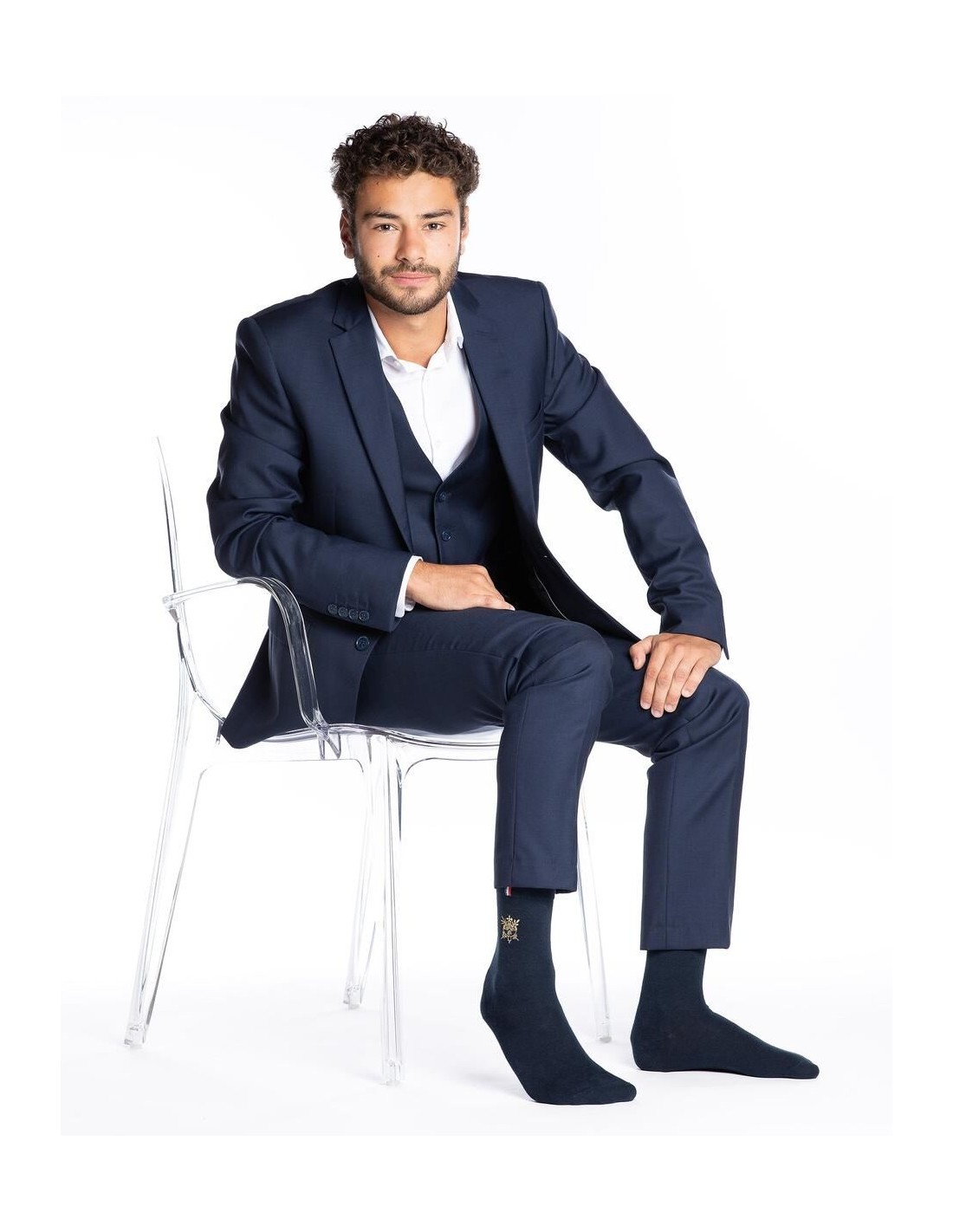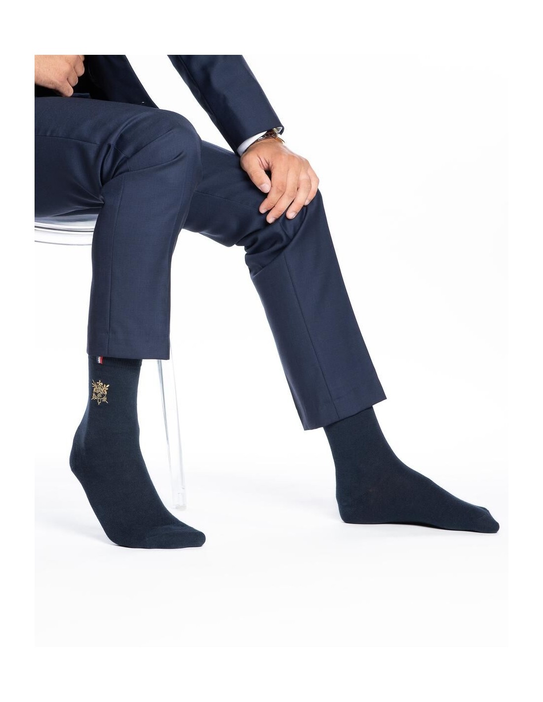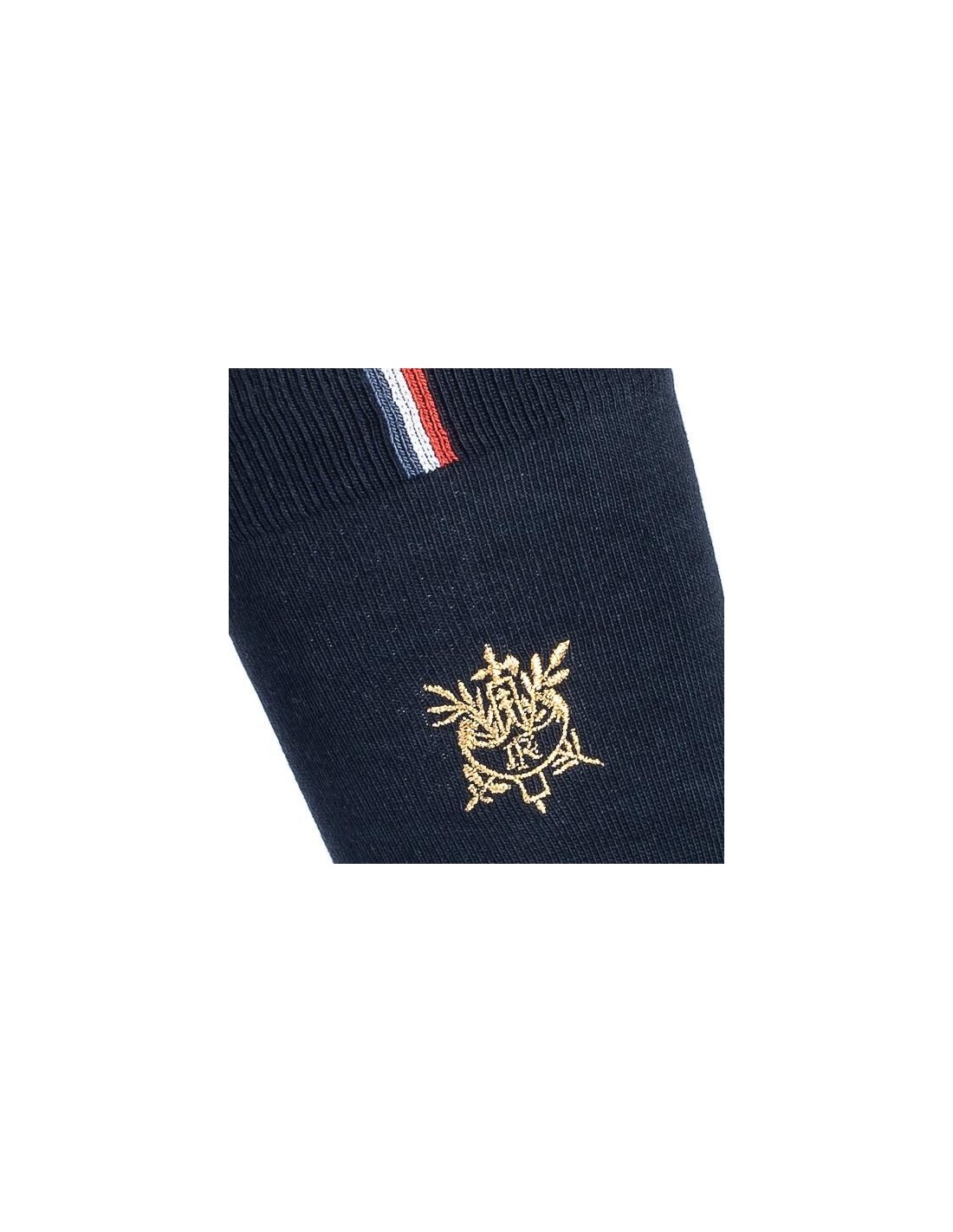 Vous êtes à la recherche d'une paire de chaussettes 100 % made in France ? Complétez toutes vos tenues par une touche d'élégance digne de la Présidence française. Cette collaboration entre la Maison Broussaud et l'Elysée rend hommage au savoir-faire français et au raffinement. Conçues à partir de textiles de qualité, ces chaussettes de couleur bleu marine sont décorées du célèbre faisceau de licteur en doré, un symbole souvent utilisé pour représenter la République française. On retrouve aussi le fameux ruban tricolore sur son bord-côte, pour un look patriote jusqu'aux orteils.