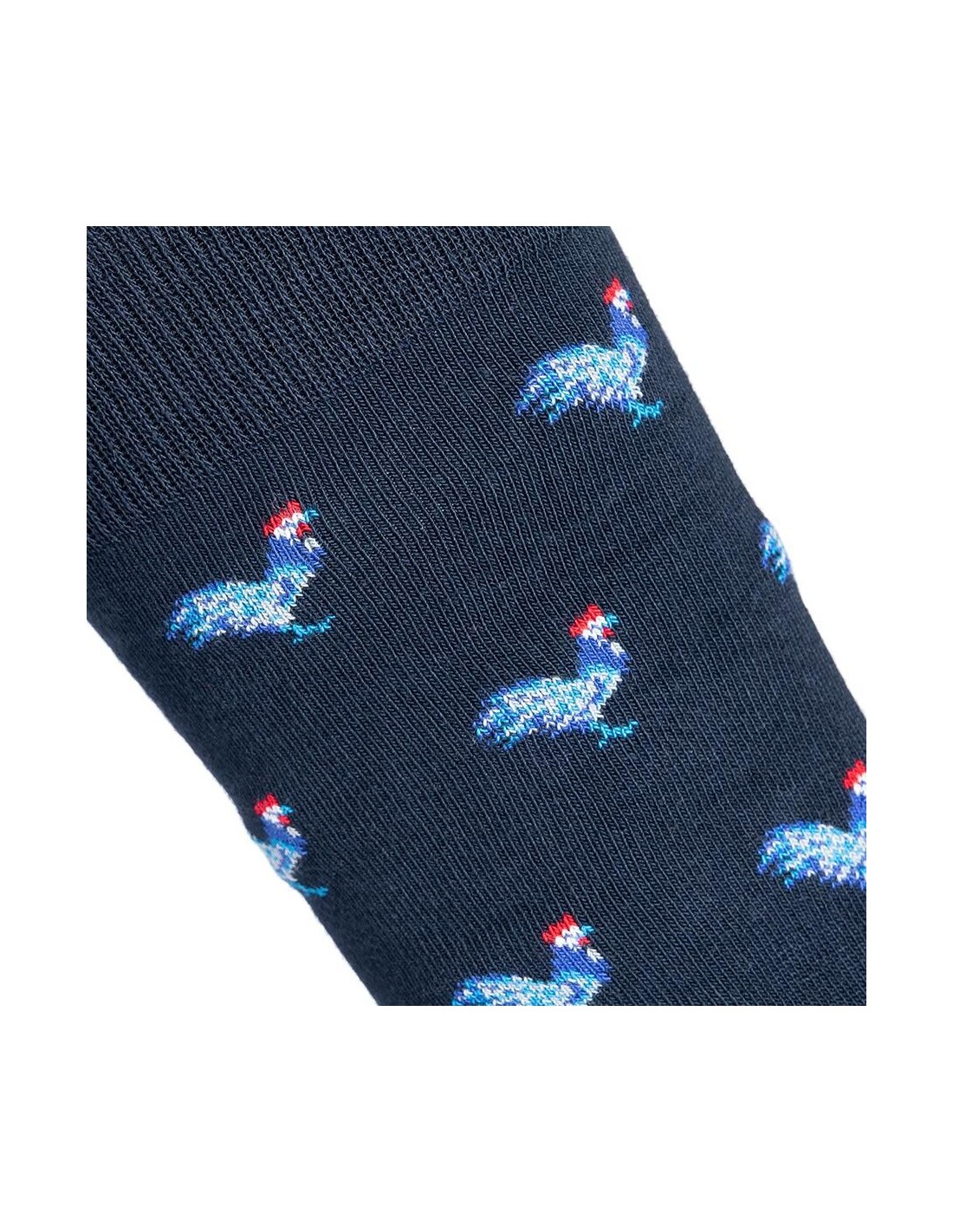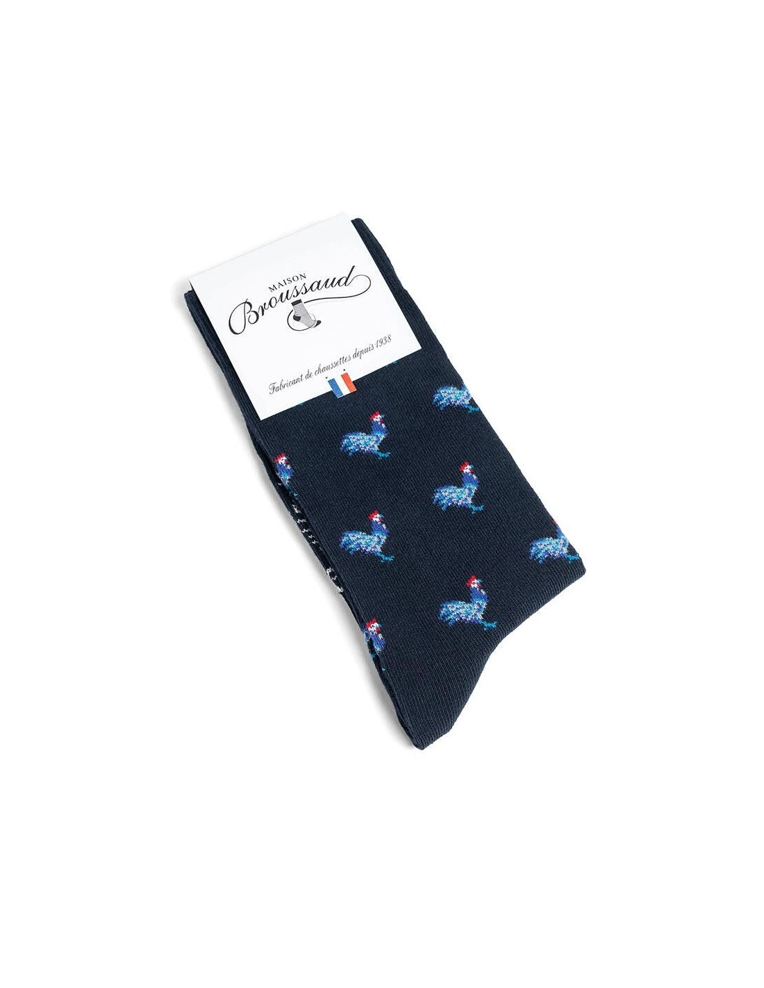 La paire de chaussettes pour homme "Les Coqs" rend hommage à notre patrimoine et au savoir-faire français. Elles sont le symbole de notre ambition et de nos valeurs. Nous sommes très fiers d'avoir présenté ce modèle au Palais de l'Élysée, lors de la deuxième édition de l'exposition du "Fabriqué en France". Décorées du motif emblématique du coq bleu, blanc et rouge sur fond bleu marine, ces chaussettes incarnent tout simplement l'élégance à la française. Soutenez la Maison Broussaud et optez pour un accessoire de mode 100% made in France qui donnera du caractère à votre look !