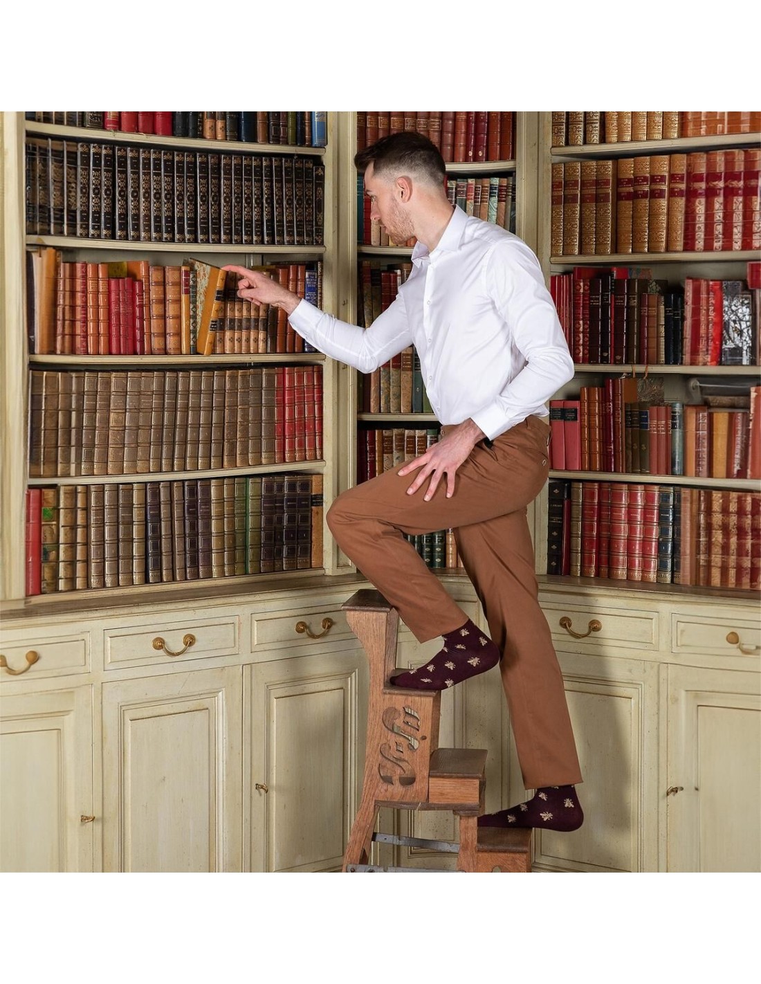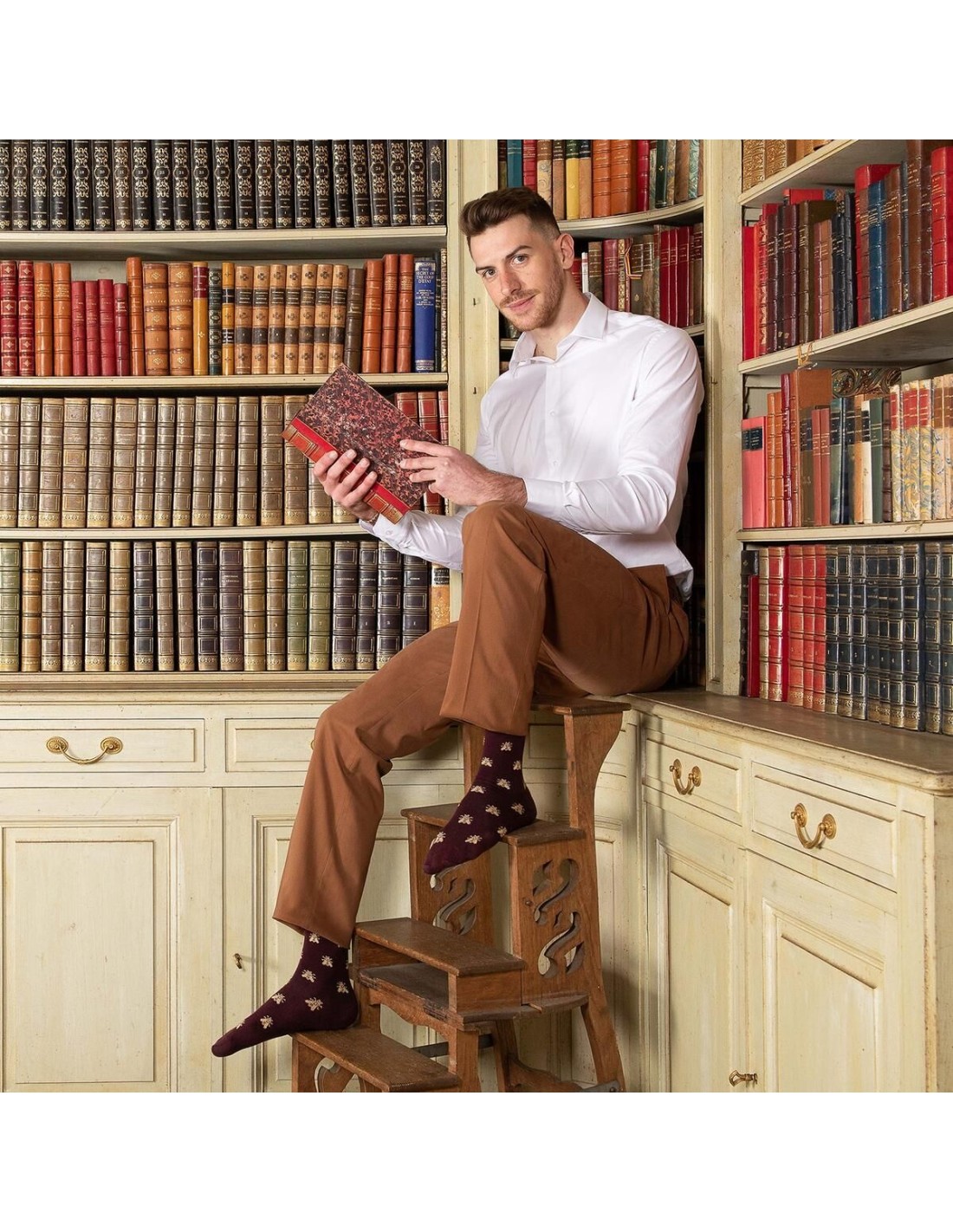 Fièrement fabriquée en France, au cœur du Limousin et dans les ateliers de la Maison Broussaud, cette paire de chaussettes incarne l'essence même du style français. Elles sont réalisées en hommage à l'Empereur Napoléon Bonaparte, dont les abeilles étaient un symbole important après l'aigle. Le motif en allover présente de délicates abeilles brodées au fil doré sur un fond bordeaux. Discrètes mais audacieuses, ces chaussettes pour hommes se prêtent à toutes les occasions. En journée ou en soirée, leur design raffiné et leur confort exceptionnel en feront une paire de choix.