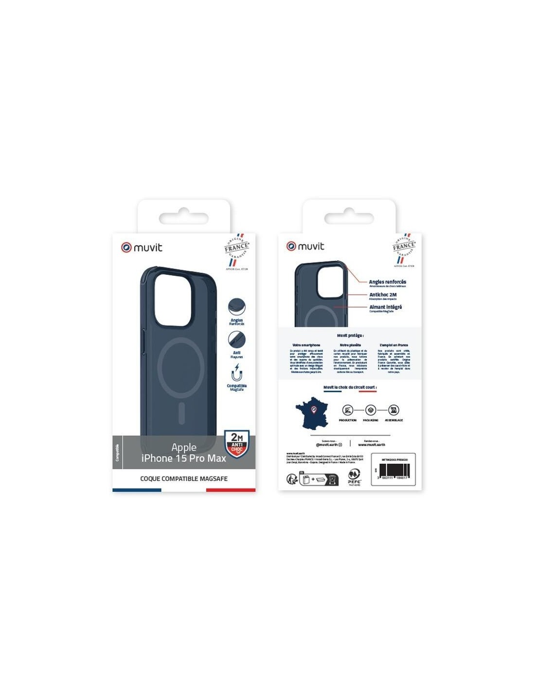 Fabriquée en France, cette coque Muvit For France garantit une protection contre les chutes jusqu’à 2 m grâce à des coins renforcés absorbant les chocs.