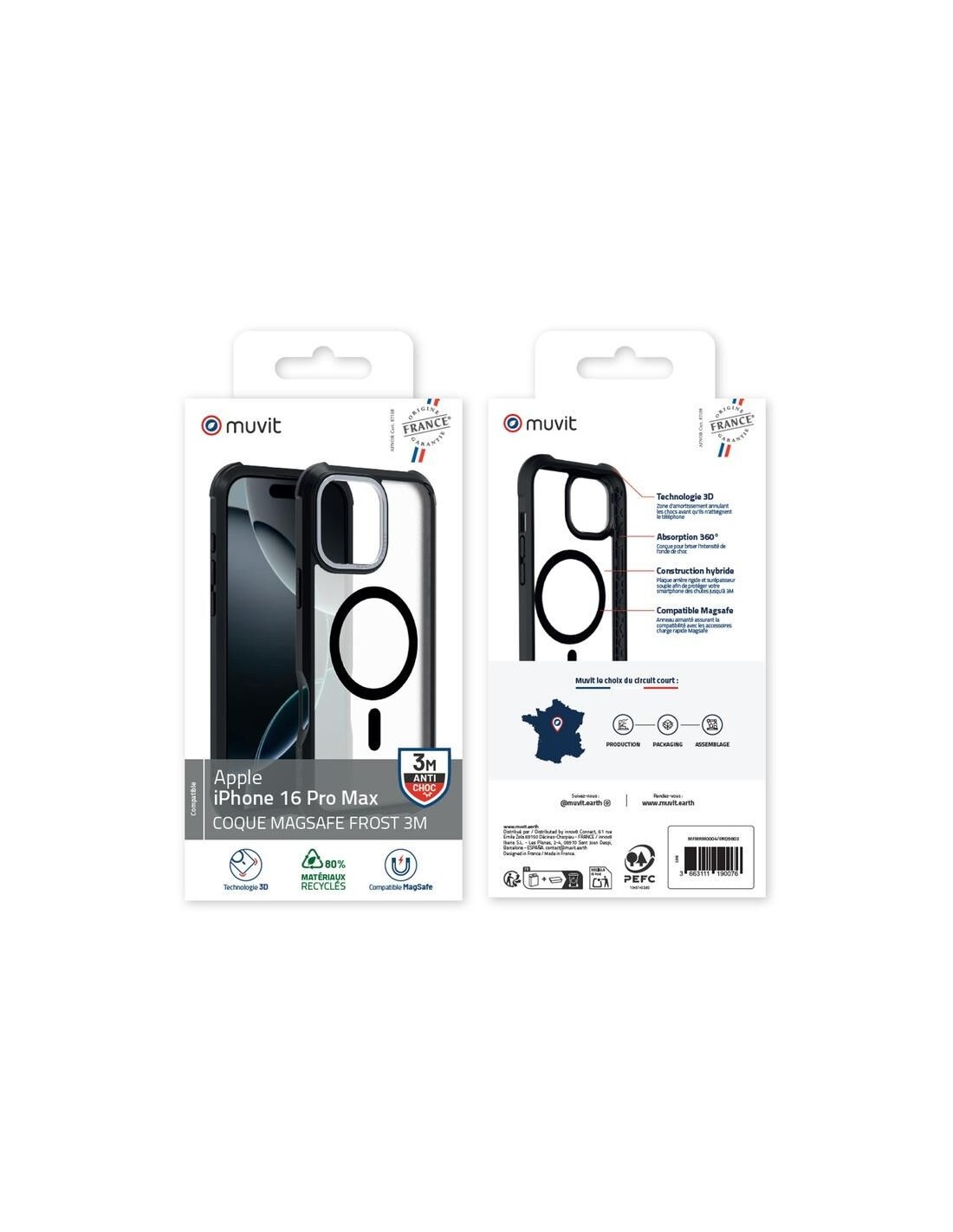 La coque MUVIT FOR FRANCE en mat froissé noir allie protection extrême et engagement écologique. Spécialement conçue pour l’iPhone 16, elle résiste à des chutes allant jusqu’à 3 mètres, grâce à une construction hybride qui combine polycarbonate (PC) et thermoplastique polyuréthane (TPU).