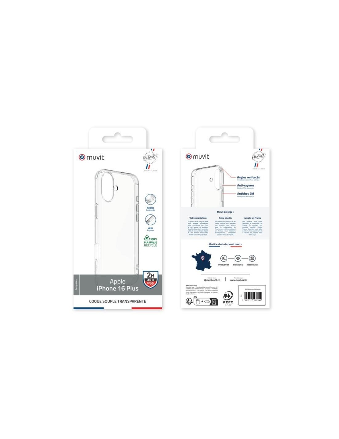 La coque transparente antichoc MUVIT FOR FRANCE pour iPhone 16 combine style, durabilité et respect de l'environnement. Fabriquée à partir de plastique 100 % recyclé, elle offre une protection maximale contre les chutes jusqu'à 2 mètres grâce à ses angles renforcés qui absorbent les chocs à 360°.