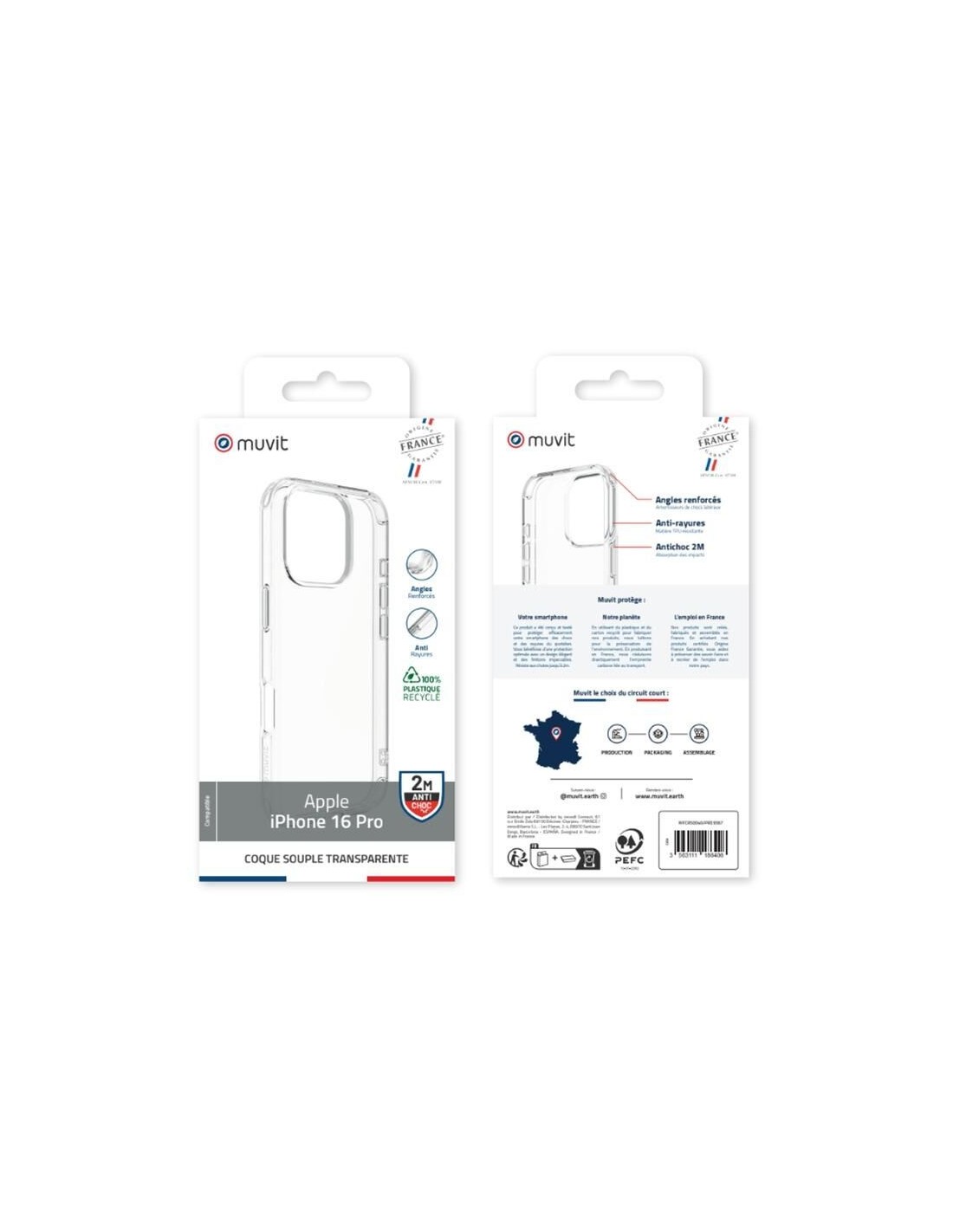 La coque transparente antichoc MUVIT FOR FRANCE pour iPhone 16 combine style, durabilité et respect de l'environnement. Fabriquée à partir de plastique 100 % recyclé, elle offre une protection maximale contre les chutes jusqu'à 2 mètres grâce à ses angles renforcés qui absorbent les chocs à 360°.