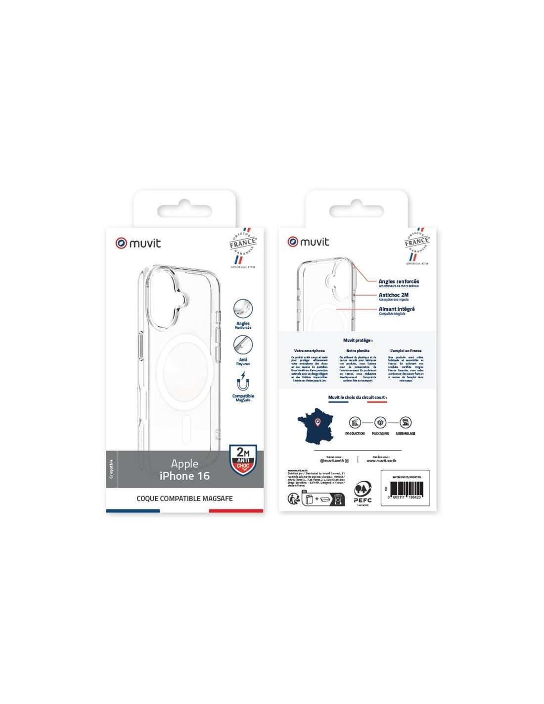 Élaborée en France et certifiée Origine France Garantie, cette coque Muvit allie transparence élégante et performance. Conçue en polyuréthane thermoplastique, elle résiste à des chutes jusqu’à 2 mètres avec des angles renforcés.