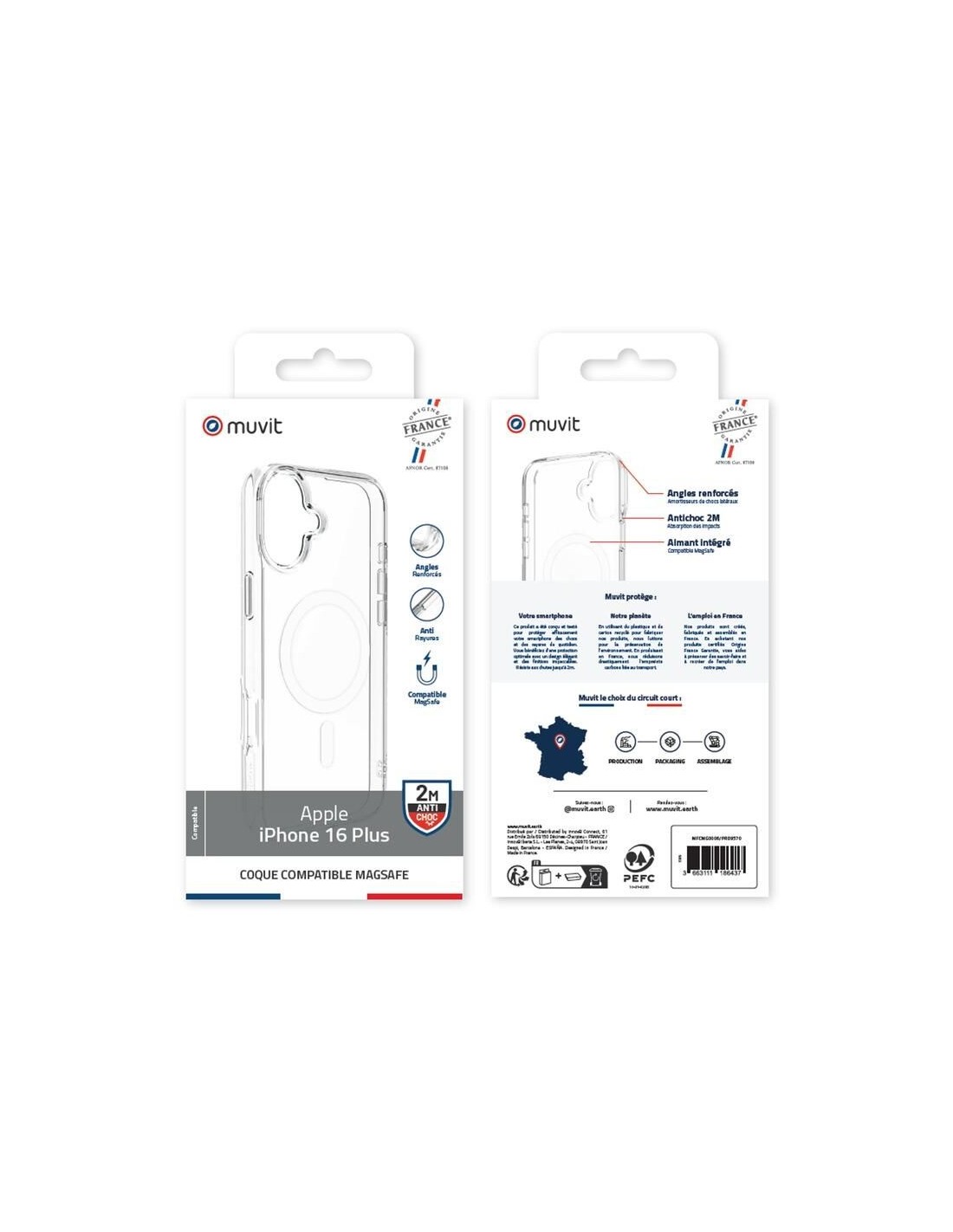 Élaborée en France et certifiée Origine France Garantie, cette coque Muvit allie transparence élégante et performance. Conçue en polyuréthane thermoplastique, elle résiste à des chutes jusqu’à 2 mètres avec des angles renforcés. Légère et épousant parfaitement les formes, elle se fait oublier tout en protégeant votre iPhone au quotidien. Compatible à 100 % avec la norme MagSafe, cette coque facilite la recharge sans fil sur tous les chargeurs magnétiques, sans avoir à retirer l’étui. Esthétique et fonctionnelle, elle s’ajuste parfaitement à votre iPhone, offrant une prise en main agréable et un montage facile. Aimantée, 100% compatible Magsafe : Chargez votre iPhone 16 sans fil sur tous les chargeurs compatibles MagSafe sans devoir retirer son étui. 100% compatible avec la norme de chargement sans fil Apple, votre coque s’ajustera sur tous les chargeurs sans fil magnétiques MagSafe et Qi2. Esthétique et Durable : Votre coque protectrice est conçue spécifiquement pour votre iPhone. Pas de flottement, elle s’ajuste parfaitement. La prise en main est confortable. Ses bords souples permettent une installation facile. Elle résiste aux agressions extérieures (transpiration, soleil, poussière…). Fabriquée en France, elle s’inscrit dans une démarche de développement durable.