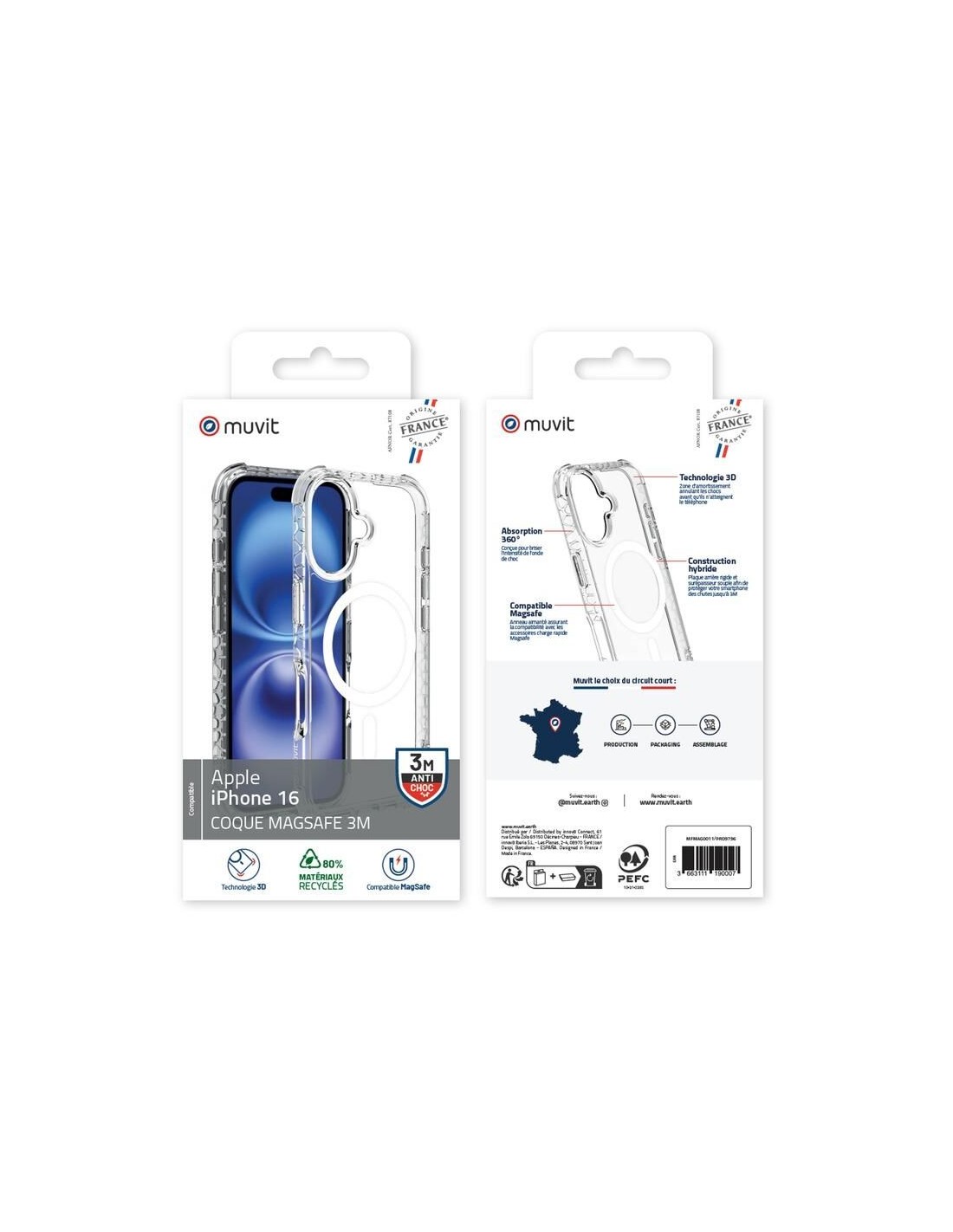 Élaborée en France et certifiée Origine France Garantie, cette coque Muvit allie transparence élégante et performance. Conçue en polyuréthane thermoplastique, elle résiste à des chutes jusqu’à 3 mètres grâce à une technologie 3D innovante absorbant efficacement les chocs. Légère et épousant parfaitement les formes, elle se fait oublier tout en protégeant votre iPhone au quotidien. Compatible à 100 % avec la norme MagSafe, cette coque facilite la recharge sans fil sur tous les chargeurs magnétiques, sans avoir à retirer l’étui. Esthétique et fonctionnelle, elle s’ajuste parfaitement à votre iPhone, offrant une prise en main agréable et un montage facile. Aimantée, 100% compatible Magsafe : Chargez votre iPhone 16 sans fil sur tous les chargeurs compatibles MagSafe sans devoir retirer son étui. 100% compatible avec la norme de chargement sans fil Apple, votre coque s’ajustera sur tous les chargeurs sans fil magnétiques MagSafe et Qi2. Esthétique et Durable : Votre coque protectrice est conçue spécifiquement pour votre iPhone. Pas de flottement, elle s’ajuste parfaitement. La prise en main est confortable. Ses bords souples permettent une installation facile. Elle résiste aux agressions extérieures (transpiration, soleil, poussière…). Fabriquée en France, elle s’inscrit dans une démarche de développement durable.