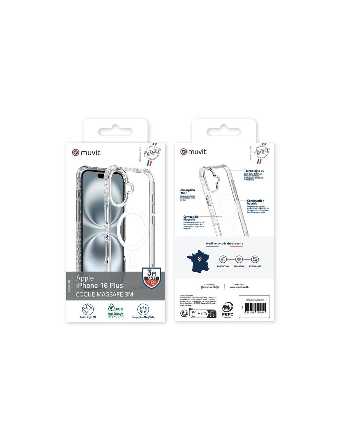 Élaborée en France et certifiée Origine France Garantie, cette coque Muvit allie transparence élégante et performance. Conçue en polyuréthane thermoplastique, elle résiste à des chutes jusqu’à 3 mètres grâce à une technologie 3D innovante absorbant efficacement les chocs. Légère et épousant parfaitement les formes, elle se fait oublier tout en protégeant votre iPhone au quotidien. Compatible à 100 % avec la norme MagSafe, cette coque facilite la recharge sans fil sur tous les chargeurs magnétiques, sans avoir à retirer l’étui. Esthétique et fonctionnelle, elle s’ajuste parfaitement à votre iPhone, offrant une prise en main agréable et un montage facile. Aimantée, 100% compatible Magsafe : Chargez votre iPhone 16 sans fil sur tous les chargeurs compatibles MagSafe sans devoir retirer son étui. 100% compatible avec la norme de chargement sans fil Apple, votre coque s’ajustera sur tous les chargeurs sans fil magnétiques MagSafe et Qi2. Esthétique et Durable : Votre coque protectrice est conçue spécifiquement pour votre iPhone. Pas de flottement, elle s’ajuste parfaitement. La prise en main est confortable. Ses bords souples permettent une installation facile. Elle résiste aux agressions extérieures (transpiration, soleil, poussière…). Fabriquée en France, elle s’inscrit dans une démarche de développement durable.