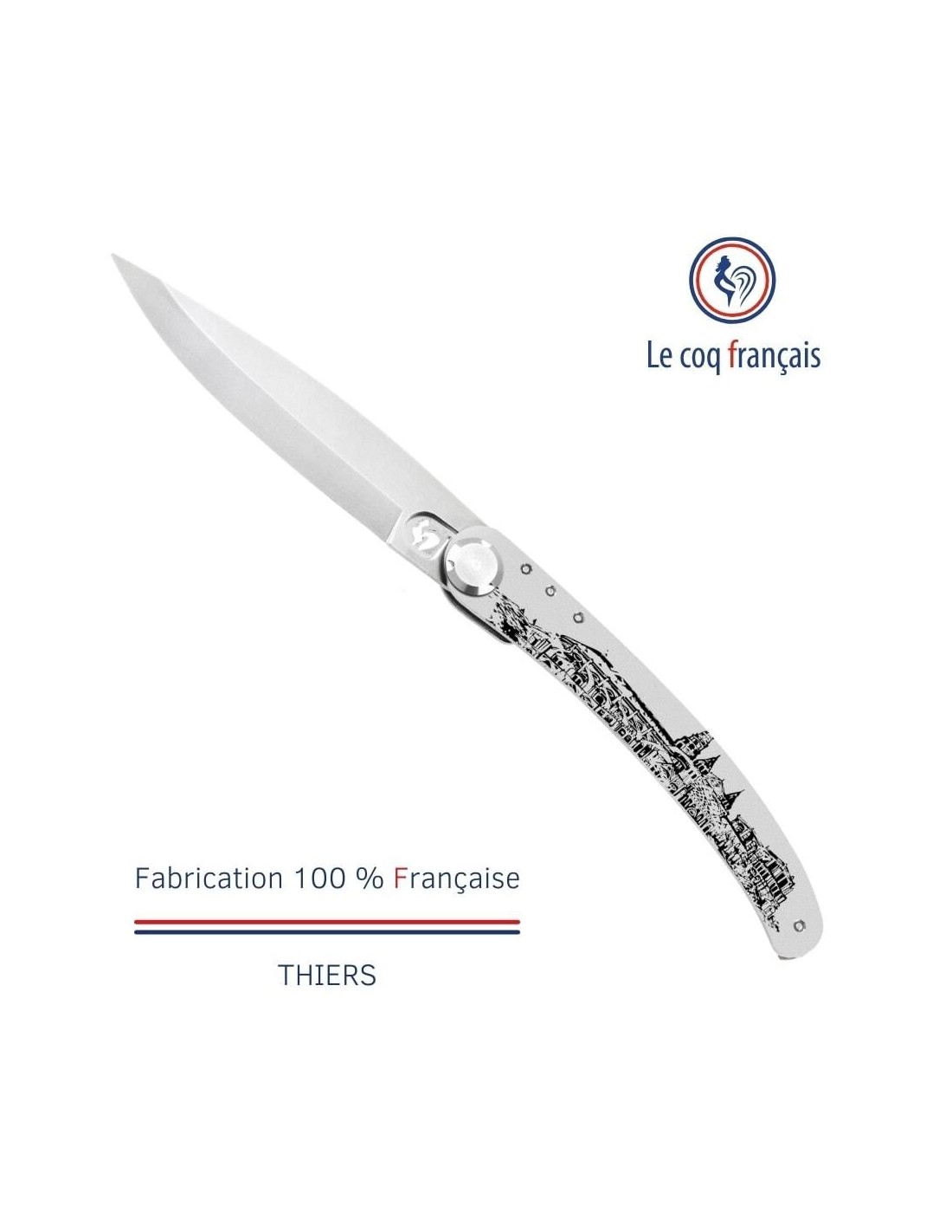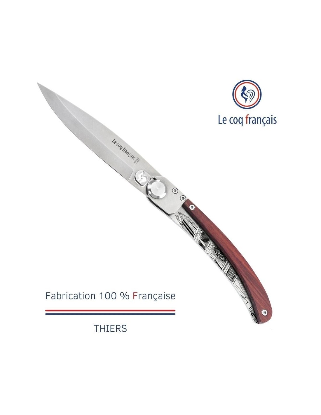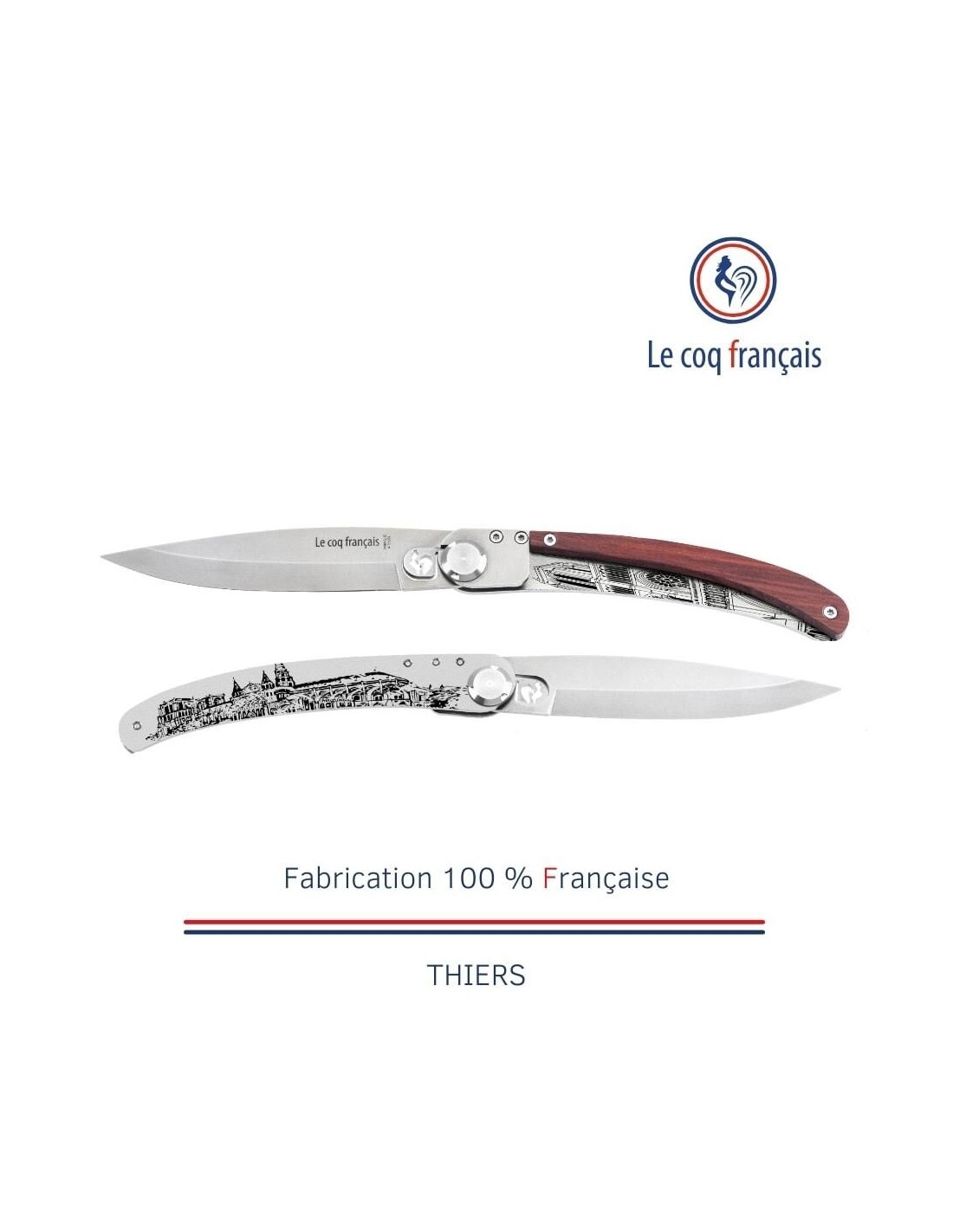 Le fameux couteaux Le Coq Français Original extra plat au design intemporel et à la gravure unique. Etui inclus.
