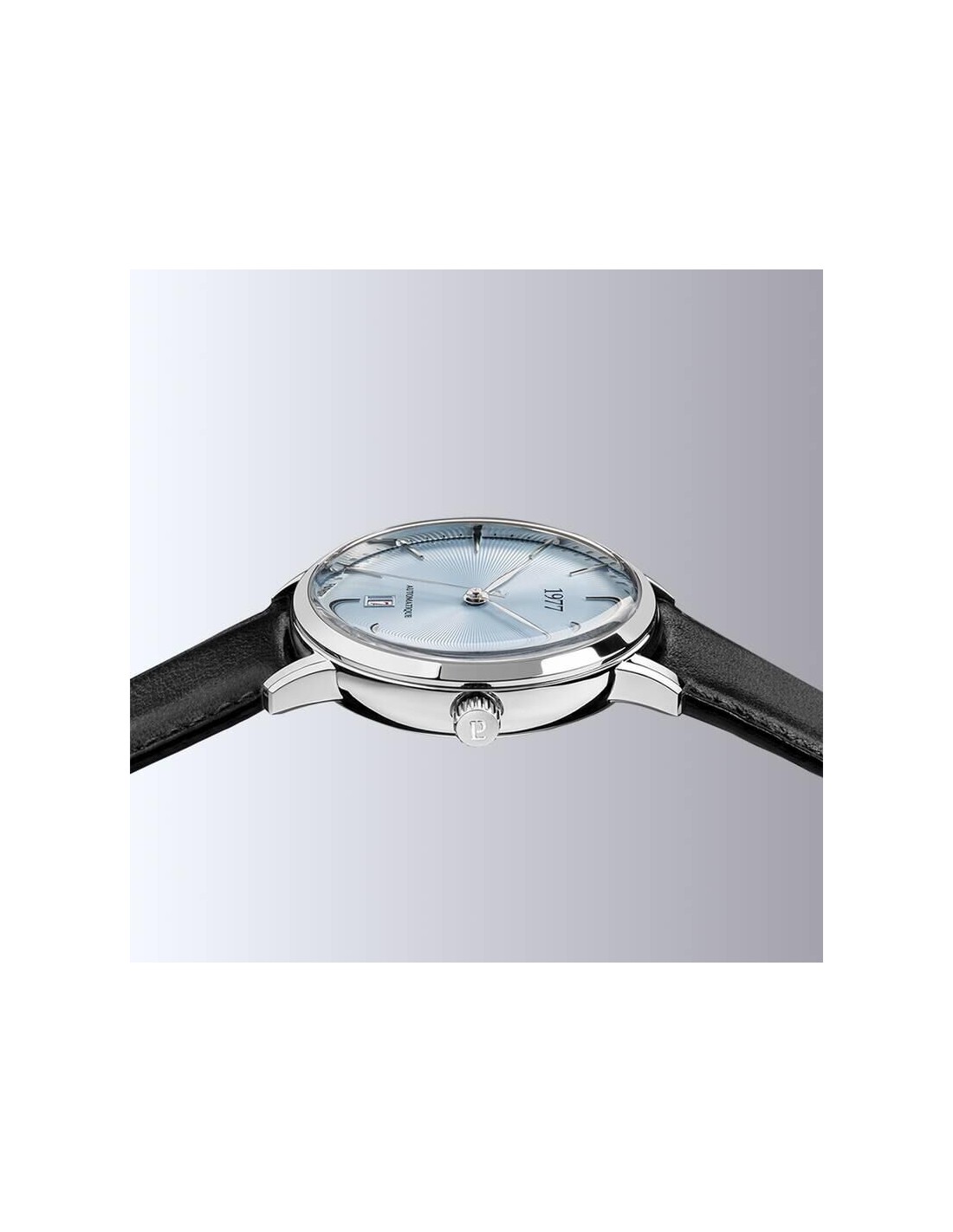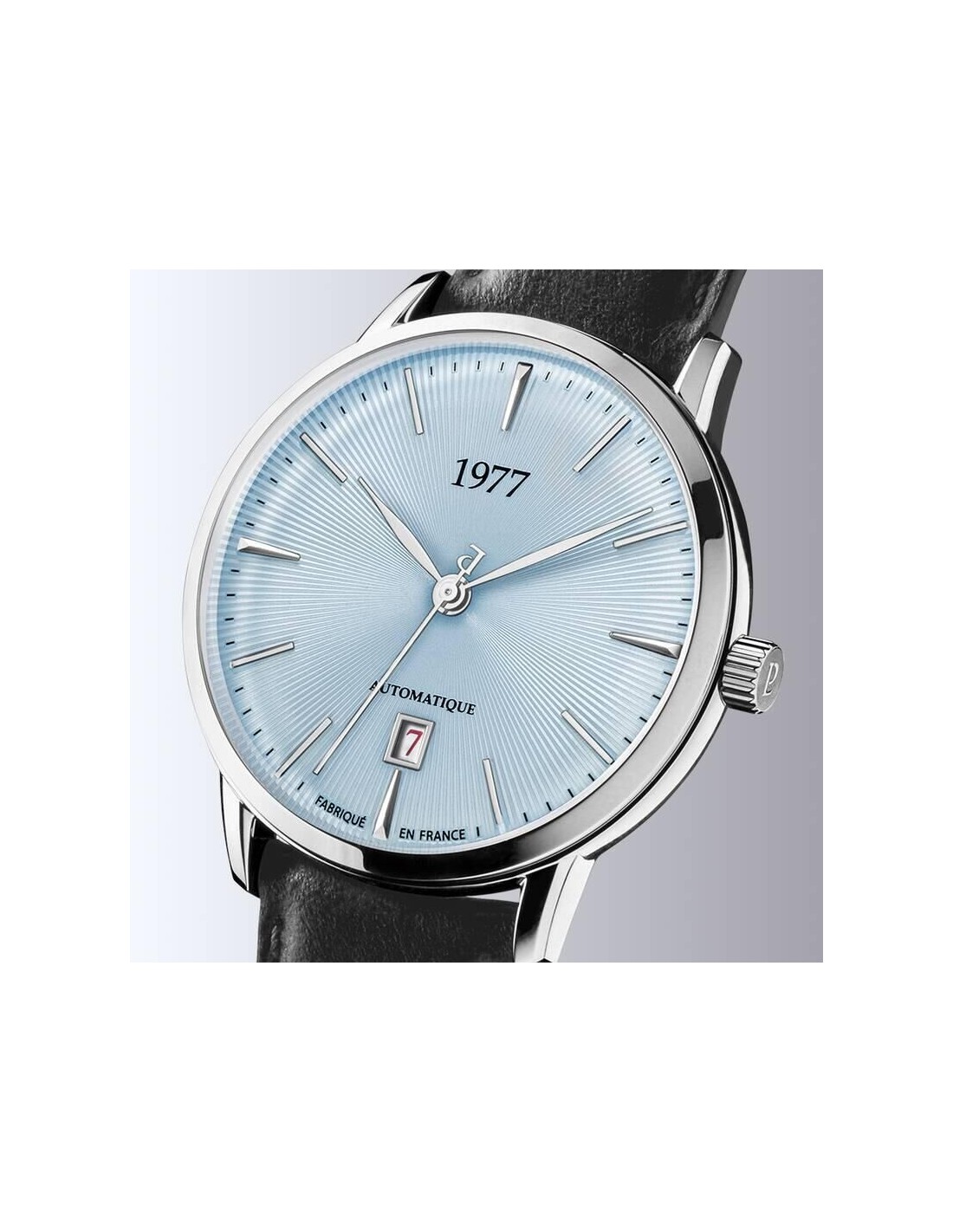 La référence 1977P01163 séduit par son cadran soleillé bleu glacier, à la fois subtil et affirmé. Un bracelet cuir noir patiné à la main complète l’ensemble avec confort et distinction. À l’intérieur, bat un mouvement automatique signé France Ébauches, offrant 44 heures de réserve de marche et une précision comprise entre -7 et +7 secondes. La présence d’un verre saphir résistant et d’un fond dévoilant la masse aux couleurs françaises souligne son ADN national. Fabriquée dans nos ateliers en Alsace, cette montre est limitée à 99 pièces et certifiée Origine France Garantie.