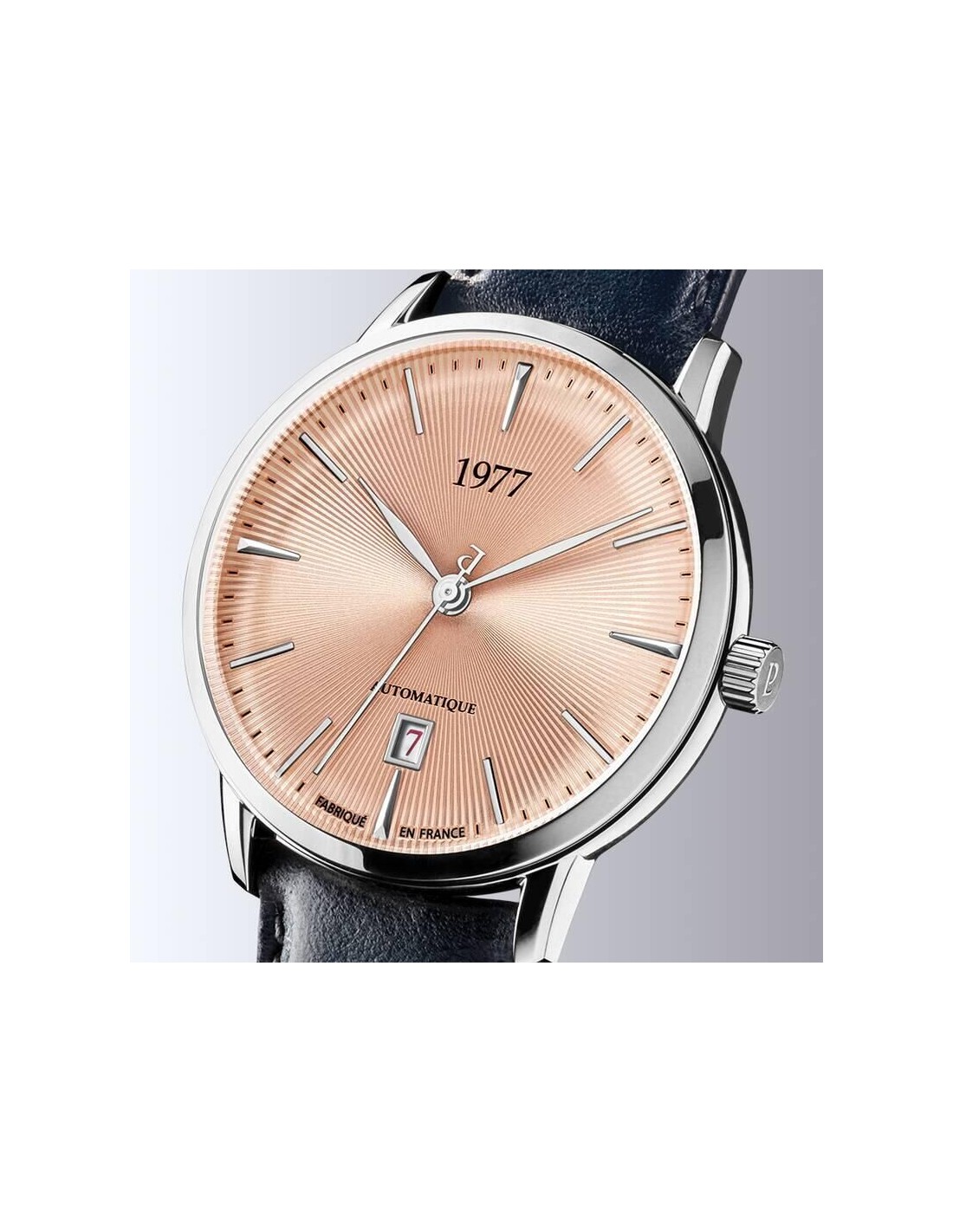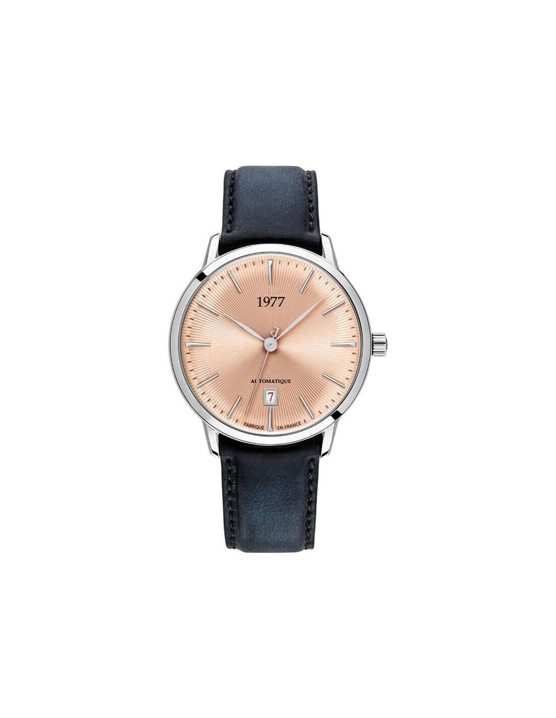 Le modèle 1977P01156 dévoile un cadran soleillé saumon lumineux, mis en valeur par une silhouette raffinée. Le choix d’un bracelet cuir bleu patiné à la main reflète le soin porté aux moindres détails. À l’intérieur, bat un mouvement automatique signé France Ébauches, offrant 44 heures de réserve de marche et une précision comprise entre -7 et +7 secondes. La transparence du fond permet d’admirer la masse décorée, tandis que le verre saphir garantit une lecture parfaite en toutes circonstances. Fabriquée dans nos ateliers en Alsace, cette montre est limitée à 99 exemplaires et certifiée Origine France Garantie.