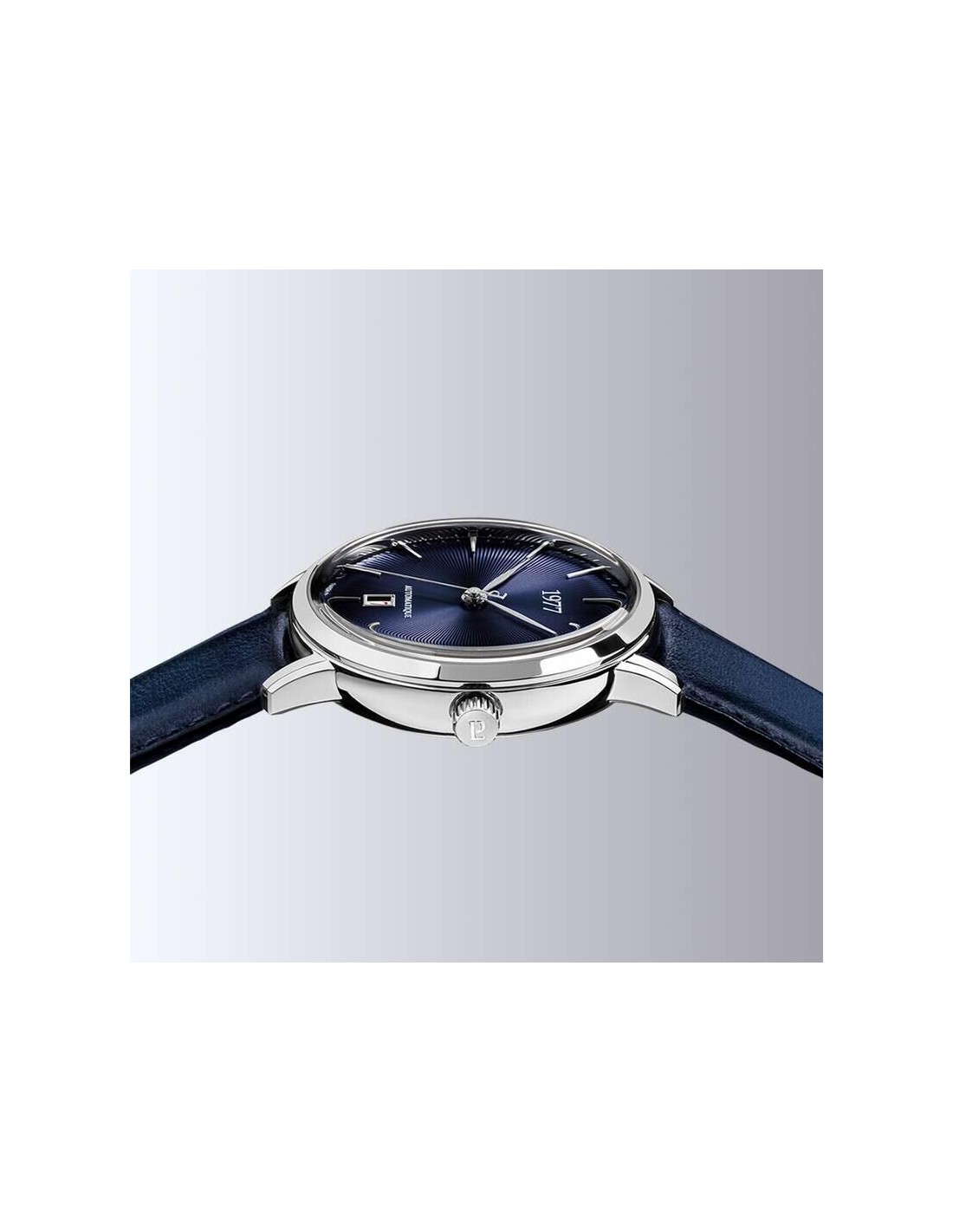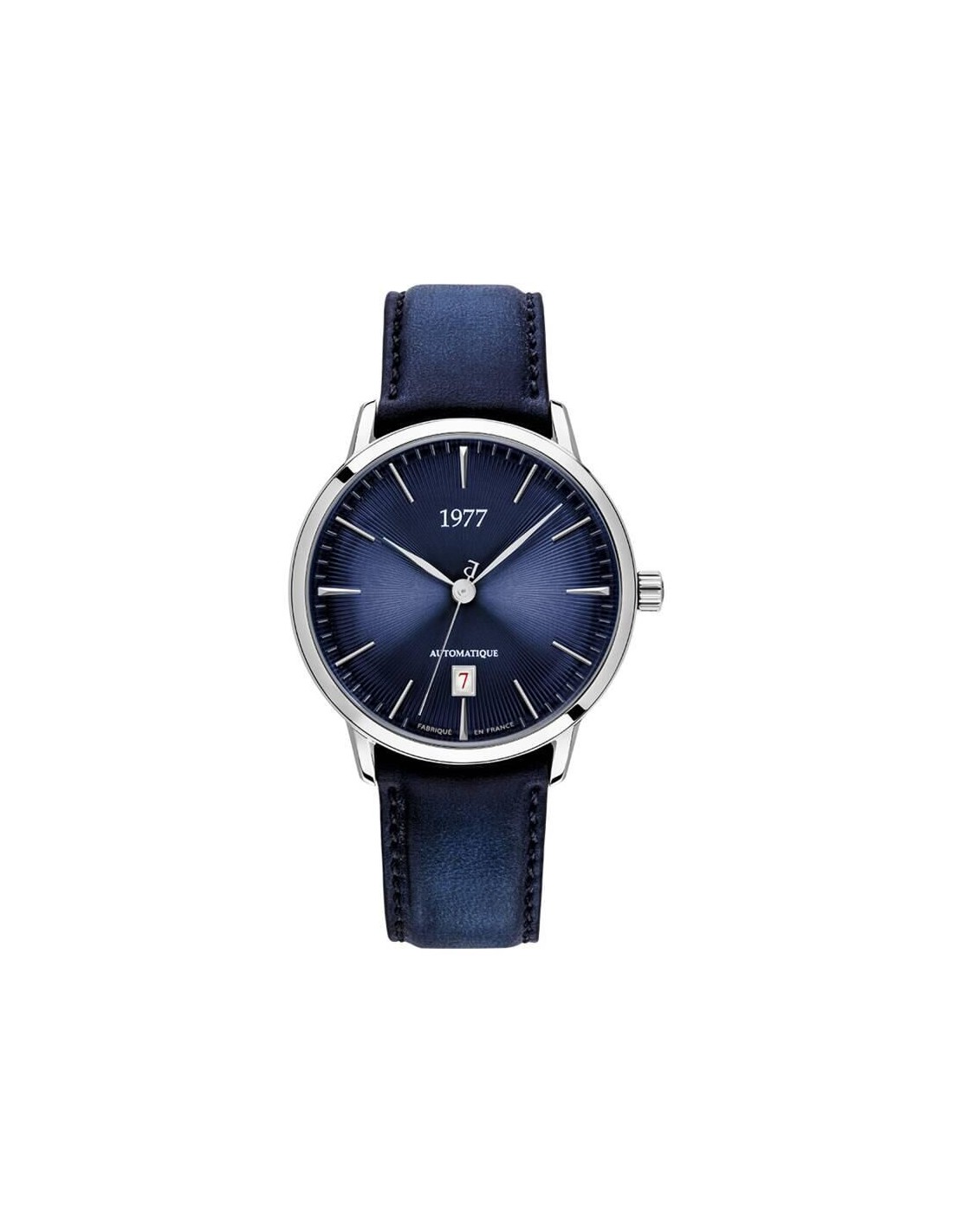 Avec son cadran fumé bleu foncé à la teinte profonde, la montre 1977P01166 conjugue modernité et tradition. Un bracelet cuir bleu patiné à la main complète l’ensemble avec confort et distinction. À l’intérieur, bat un mouvement automatique signé France Ébauches, offrant 44 heures de réserve de marche et une précision comprise entre -7 et +7 secondes. Sous le verre saphir, la montre révèle une masse oscillante décorée du drapeau français, emblème de son ancrage local. Fabriquée en France et produite à seulement 99 exemplaires, elle est porteuse du label Origine France Garantie.