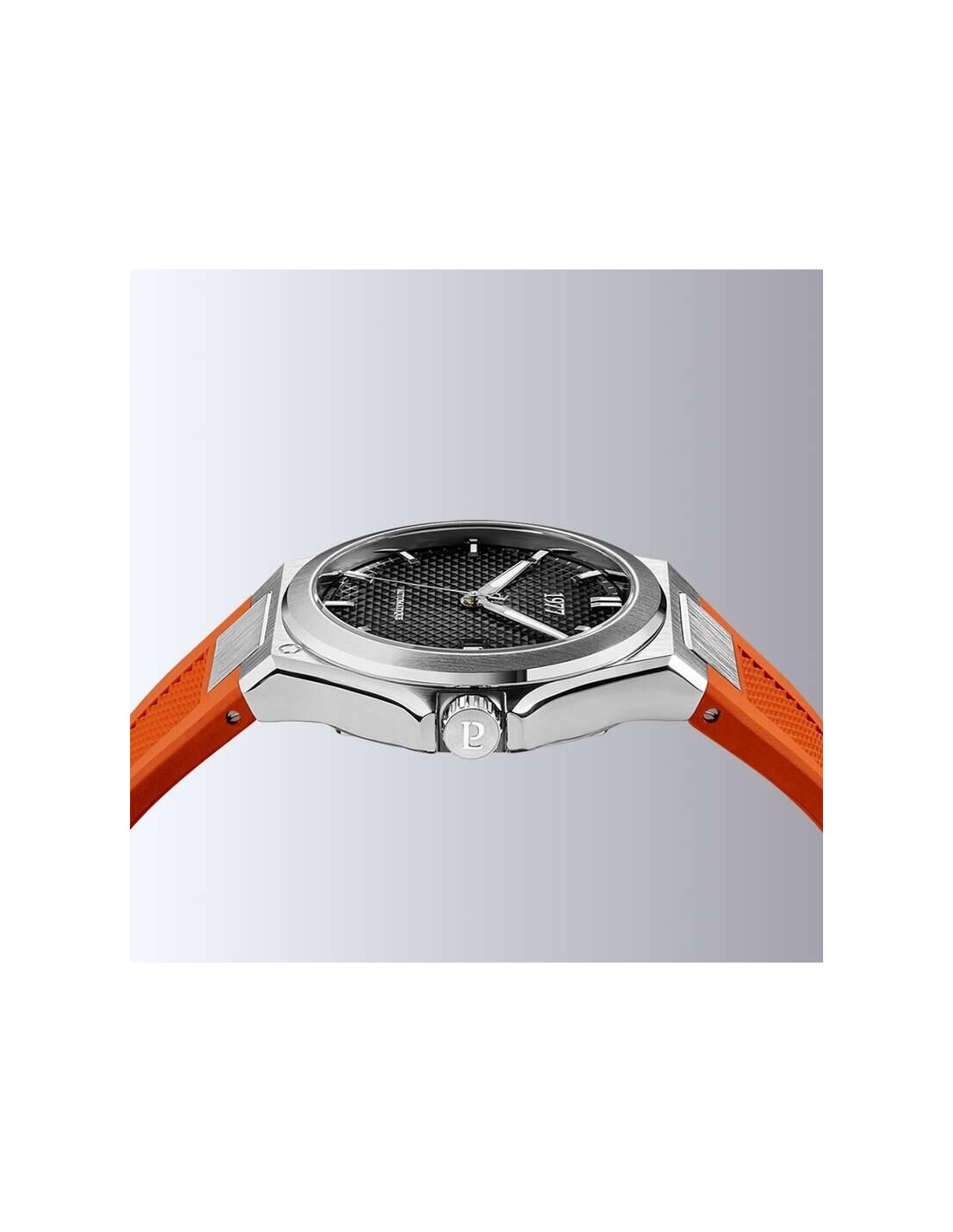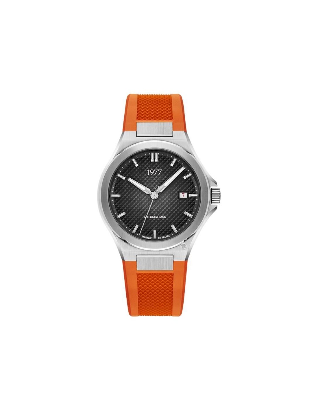 Avec son cadran fumé noir à la teinte profonde, la montre 1977P02138 conjugue modernité et tradition. Un bracelet FKM orange complète l’ensemble avec confort et distinction. Le cœur de cette montre est animé par un calibre France Ébauches, réputé pour sa stabilité et sa réserve de 44 heures. Le verre saphir traité antireflet protège la pièce, tandis que la masse oscillante tricolore est visible à travers le fond transparent. Chaque exemplaire, numéroté et monté à la main en France, bénéficie du label Origine France Garantie.