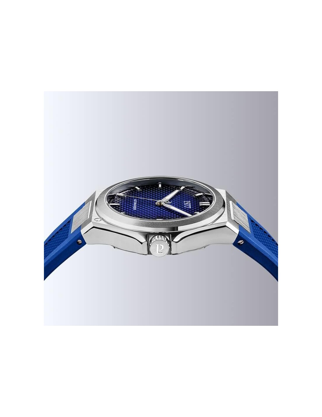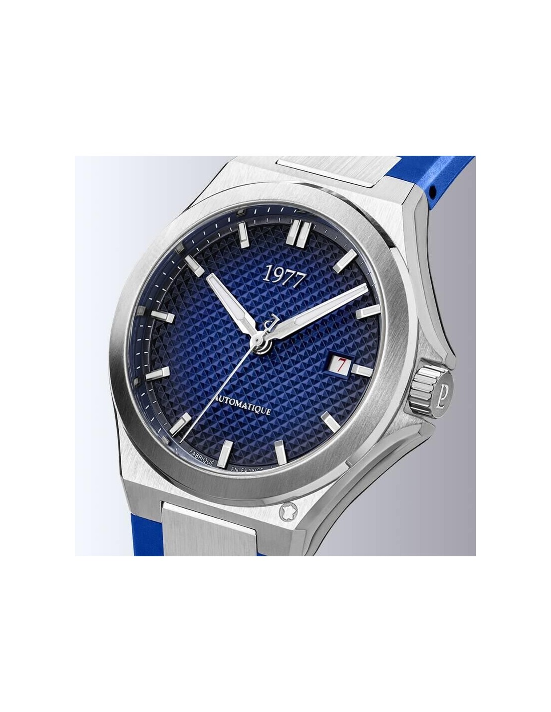 Avec son cadran fumé bleu intense et son bracelet FKM bleu à haute résistance, cette montre 1977 est pensée pour les hommes à l’élégance affirmée et à l’esprit aventurier. Le boîtier en acier 904L, à la fois robuste et raffiné, est protégé par un verre saphir traité anti-rayures. Le calibre automatique France Ébauches délivre une réserve de marche de 44 heures et une régularité de précision entre -7 et +7 secondes. Le fond transparent dévoile une masse oscillante personnalisée, aux couleurs du drapeau français. Fabriquée en France, cette montre est produite en 99 exemplaires numérotés et bénéficie du label Origine France Garantie.