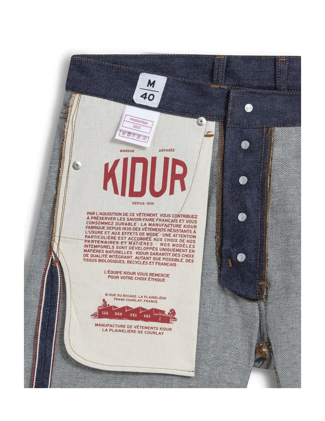 GABRIEL est le JEAN par KIDUR. Issu de l’étude des denim produits par KIDUR dans les années 80, nous nous sommes inspirés de nos pièces d’archives pour concevoir un vêtement qui dure. Dessiné, conçu chez KIDUR à La Plainelière de Courlay, le Jean GABRIEL a été confectionné par un petit groupe de couturière autour d’Elise notre prototypeuse. Comme toute la collection, GABRIEL est fabriqué en France et est certifié Origine France Garantie (OFG).