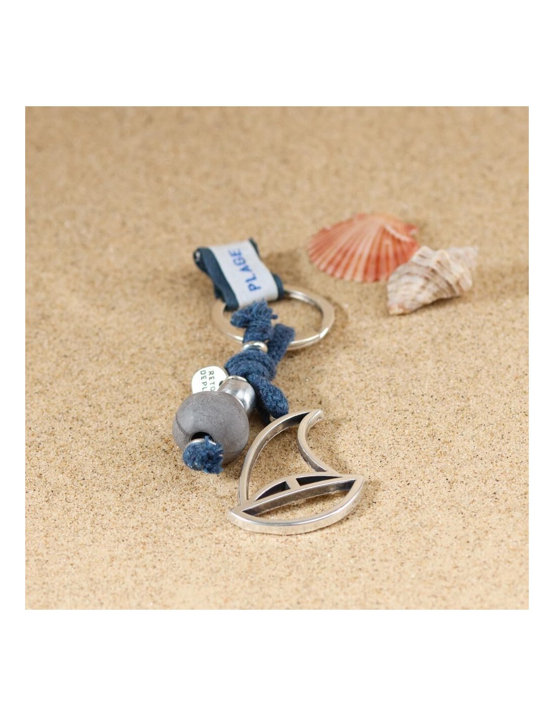Véritable invitation à l’évasion, le porte-clé voilier invite à voyager vers des horizons lointains. Monté sur un cordon en écojean (constitué de fibres recyclées issues de jean usagé et bouteilles en plastique recyclées), il évoque l’univers marin et les grands espaces.