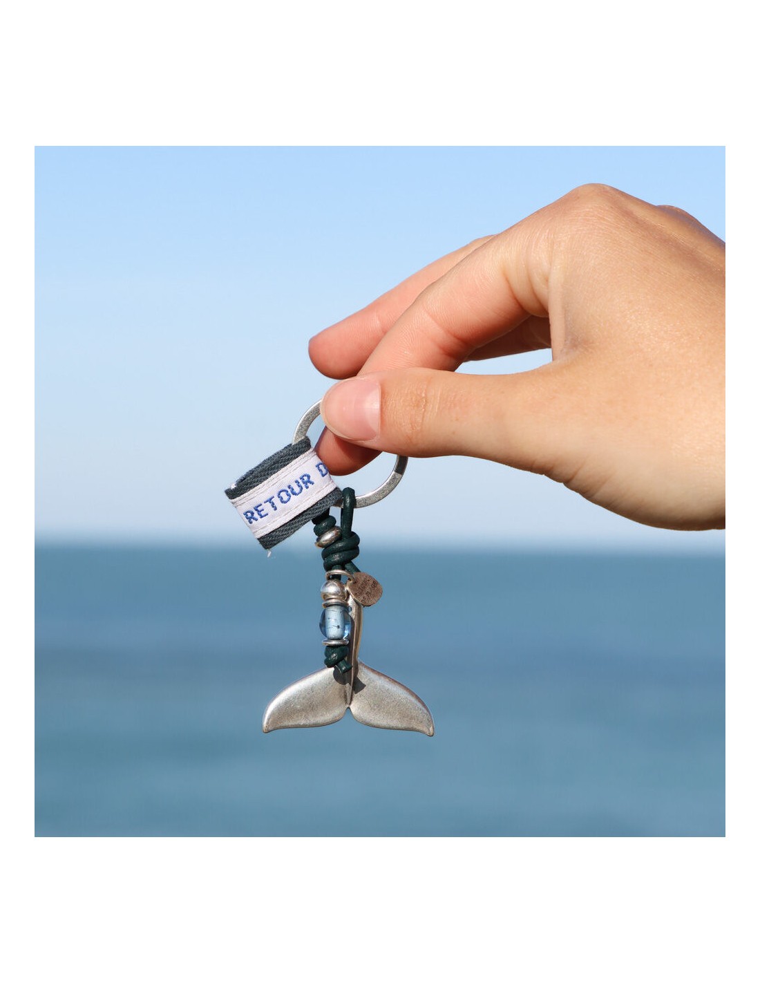 Pour garder ses souvenirs de vacances toujours sur soi, le porte-clé Arcachon associe un pendentif argenté en forme de queue de baleine à une jolie perle de verre translucide.