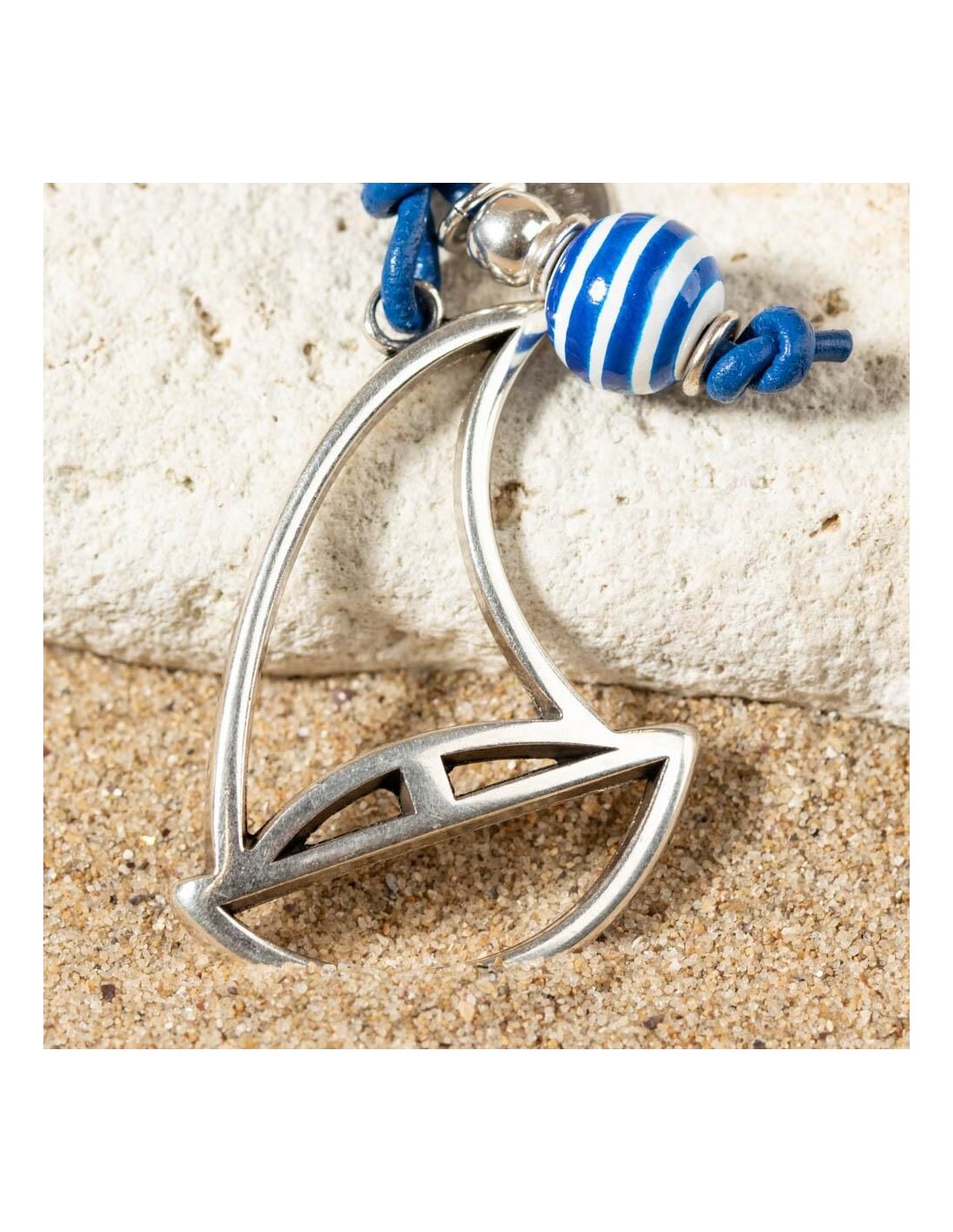 Ce porte-clé Yacht vous donne des envies de balade en mer sur un voilier. Un accessoire à l'esprit bord de mer avec un pendentif argenté en forme de bateau et sa jolie perle rayée.