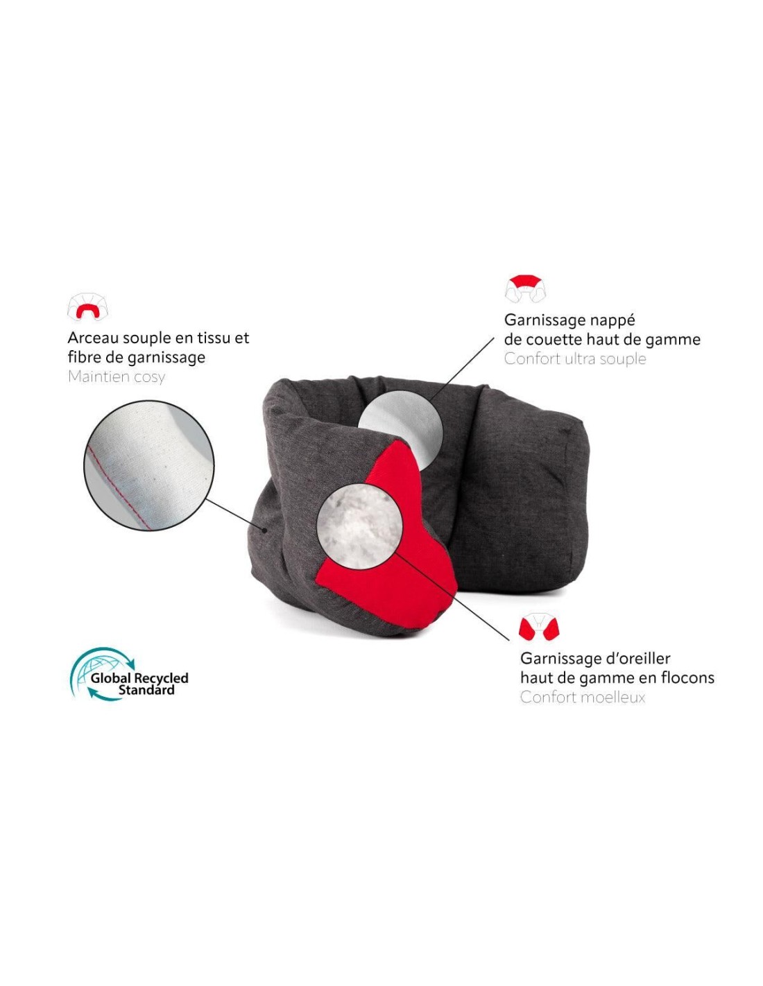 Sa structure entièrement souple couvre la nuque et les oreilles pour créer un effet “dans ma bulle” en atténuant les sons extérieurs. Il évite une inclinaison trop forte de la tête sur les côtés ou vers l’avant et favorise ainsi l’endormissement en douceur. C'est un coussin de voyage haut de gamme qui a nécessité plus d’un an de recherche et développement.