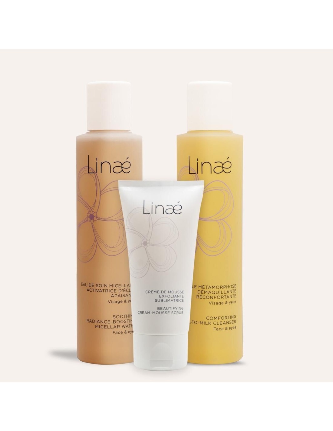 - Eau de soin micellaire : Une eau délicate pour parfaire le démaquillage, défatiguer le regard et activer l’éclat du visage en un seul geste.
